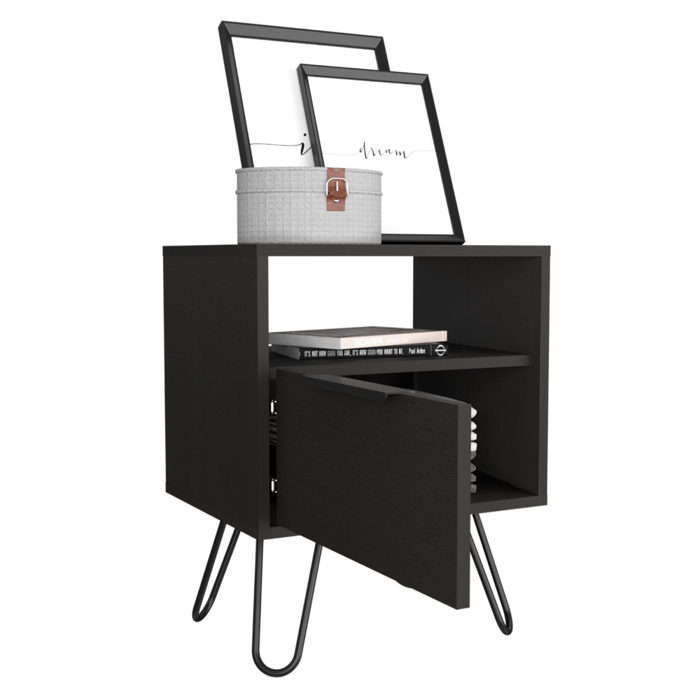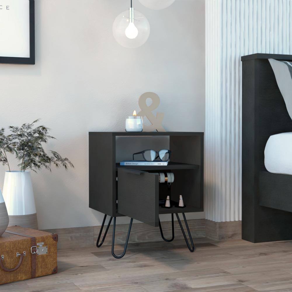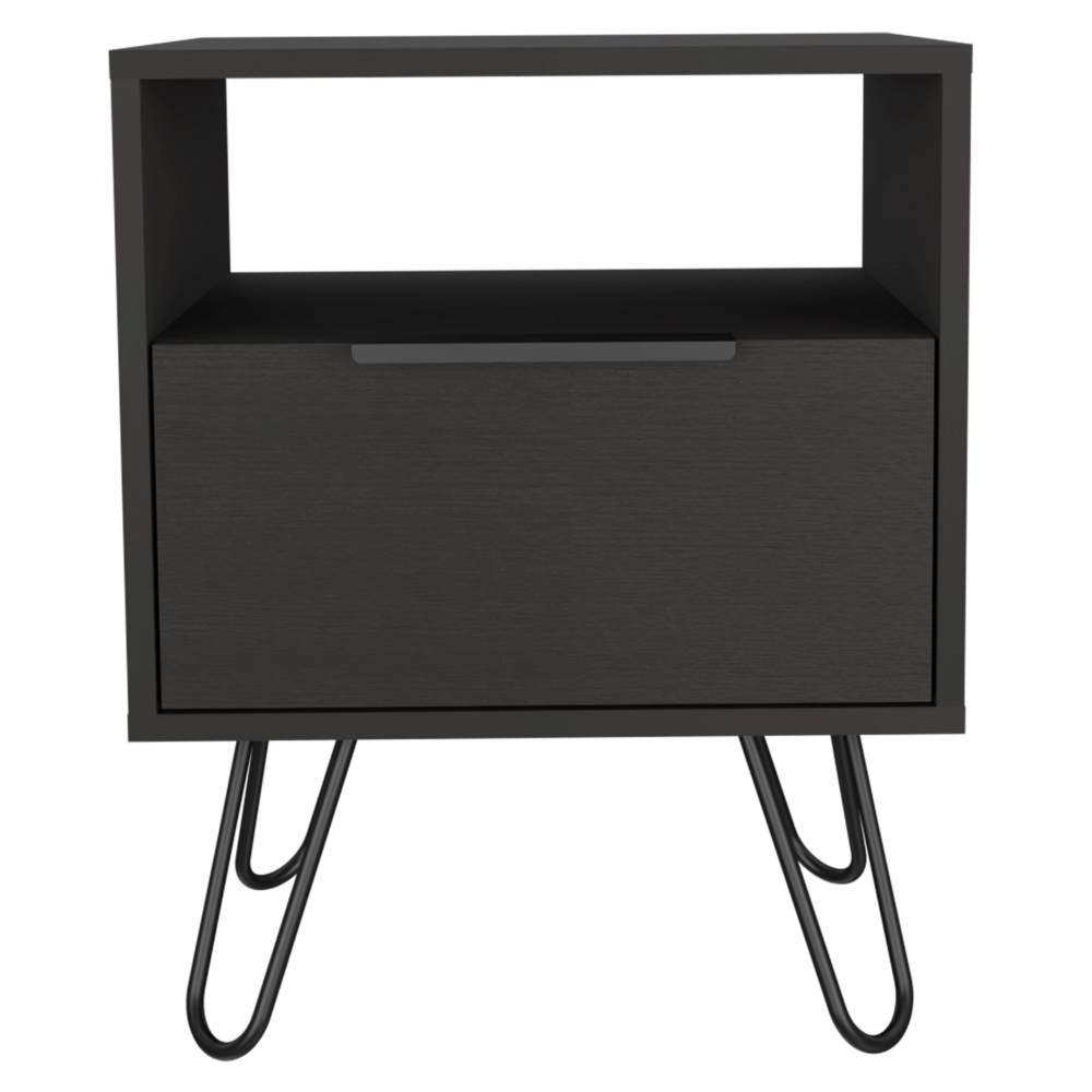 The Skyoner Nightstand is the perfect addition to any modern bedroom, combining style and functionality in one elegant piece. With its sleek black wengue finish and contemporary hairpin legs, this nightstand not only enhances your bedroom decor but also provides practical storage solutions. Measuring at a height of 22.2 inches, it is designed to fit seamlessly into smaller spaces, making it an ideal choice for apartments or cozy bedrooms.