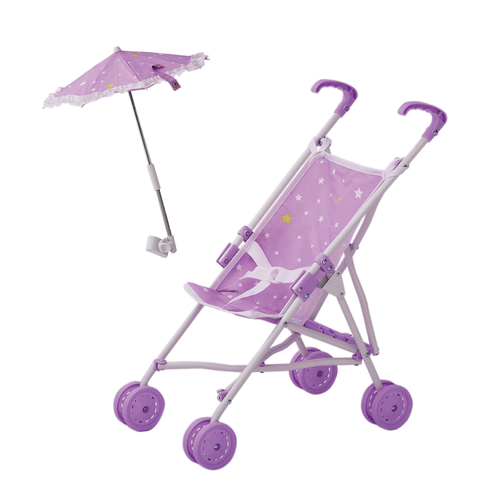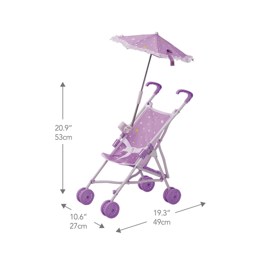 STYLE: This beautiful purple twinkle stars stroller pushchair offers a hint of luxury to your little ones dolls. The parasol can be adjusted open/closed and with several angles to ensure dolly is out of the sun/rain. Doll not included.
