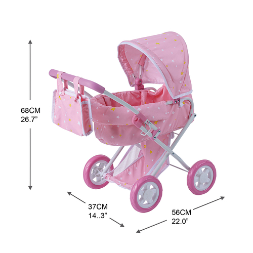 STYLE: This stunning baby doll stroller is a perfect stroller for 16 - 18” baby dolls. 2 in 1 system, fully functions as a stroller and also hand baby carrier. The seat can be faced either way. Doll not included.