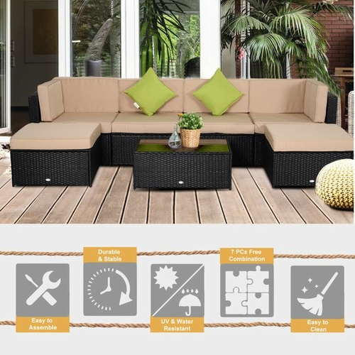 This high quality rattan sofa furniture in stylish design is the affordable alternative to your couch or chair. Finest steel frame and PE wicker in excellent craftsmanship make it look amazed and fashionable inside your house or in outdoor garden. 2 throw pillows, 6 seat cushions and 6 back cushions are included for higher degree of comfort. Washable cushion cover is assembled with zipper. Tea table has tempered black glass on its surface. Enjoy lounging time with your friends in the comfortable garden sets.