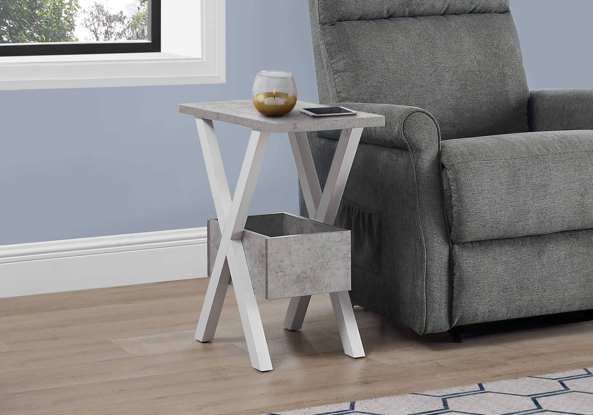 Featuring a sophisticated grey laminate finish that mimics the look of cement, this accent table adds a touch of elegance to your space. The smooth surface is not only visually appealing but also easy to clean, making it a practical choice for busy households. The sturdy white cross legs provide stability and enhance the overall aesthetic, ensuring that this table stands out in any room.