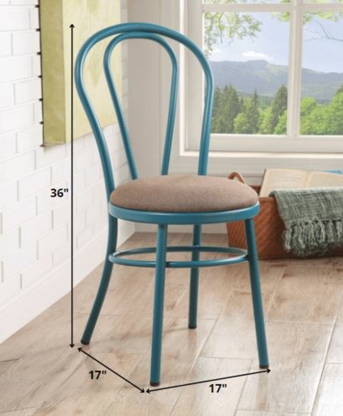 The standout feature of these dining chairs is their restaurant-style look, which adds a sophisticated touch to your home decor. The glossy teal finish of the metal frame creates a striking contrast with the round taupe fabric upholstered seat, making these chairs a stylish addition to any dining room or small living area. The armless design allows for easy movement and makes them versatile for various settings.