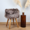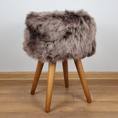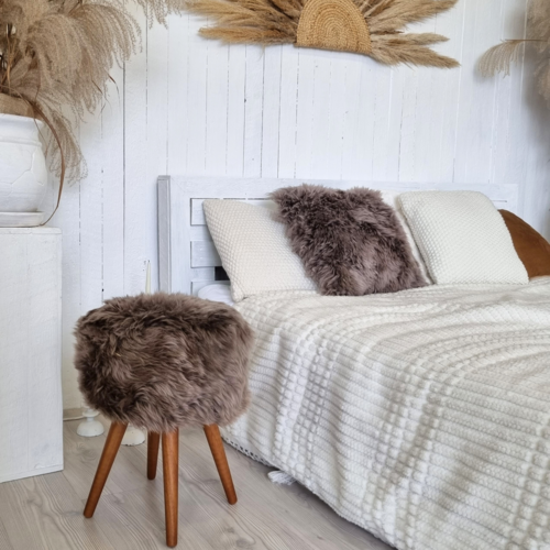 Taupe sheepskin stool with oak legs – a perfect blend of luxury and natural charm. The luscious texture of the brown sheepskin adds a cozy and inviting feel, while the sturdy oak legs ensure durability and a timeless aesthetic.
