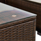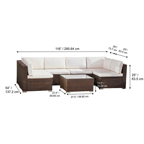 Now your entire family can gather around together with the Teamson Home 7 piece Rattan Outdoor Garden Furniture sofa and table patio Set. The 7 piece set includes multiple chairs that can be arranged to suit your space. The dark brown woven rattan complements the soft ivory cushions providing maximum comfort and support. A matching rattan coffee table features a glass top for long lasting use and an easy to clean surface.