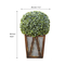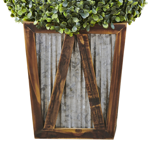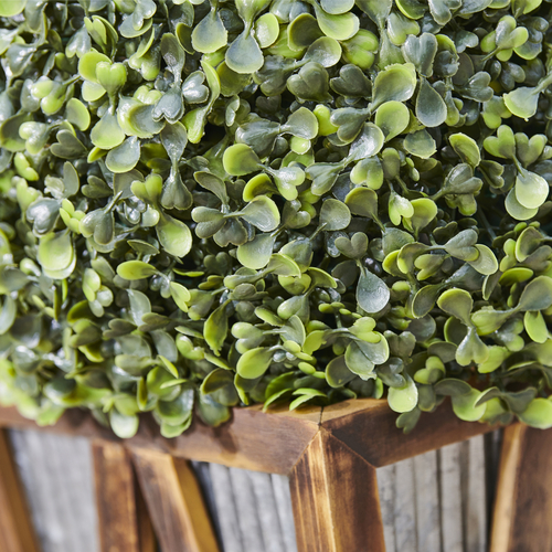 The artificial topiary bush is lush green in colour and perfectly round, as you never have to trim! The frame house style planter, is rustic in look with dark brown wood like feature.