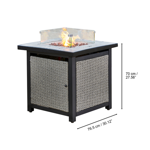 This light weight gasfire pit is made of dark brown woven rattan with a door so you can store your gas canister with ease. The square top of the firepit is a wooden like ceramic finish in a complimentary dark brown colour and this area can be used to rest glasses or cups when entertaining. It also comes with a glass shield which can assist with keeping the wind at bay and also for safety purposes.