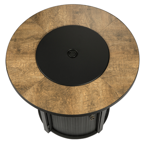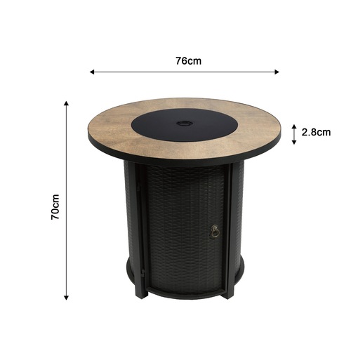 2 IN 1 GAS FIRE PIT TABLE 76CM: This versatile tall, round fire pit can be converted into an outdoor table when not in use by covering the burning area with the lid provided. Tabletop thickness: 2.8cm. Adjustable flames from low to high are a feature of this black and brown metal fire-pit . Featuring a battery push button piezo ignition for easy start. Requires 1x AAA battery (Battery included). A 9kg propane tank will last approximately 11.5 hours at a continuous burn at the maximum output.