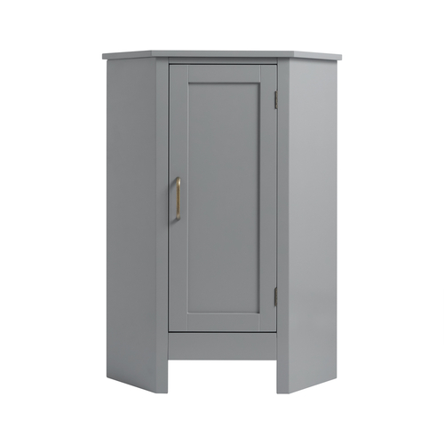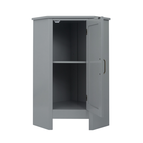 STYLISH CORNER FLOOR CABINET: Features a sleek grey finish with brass handles for an elevated and stylish addition to your space, and the wedge shape fits perfectly in corners and narrow spaces