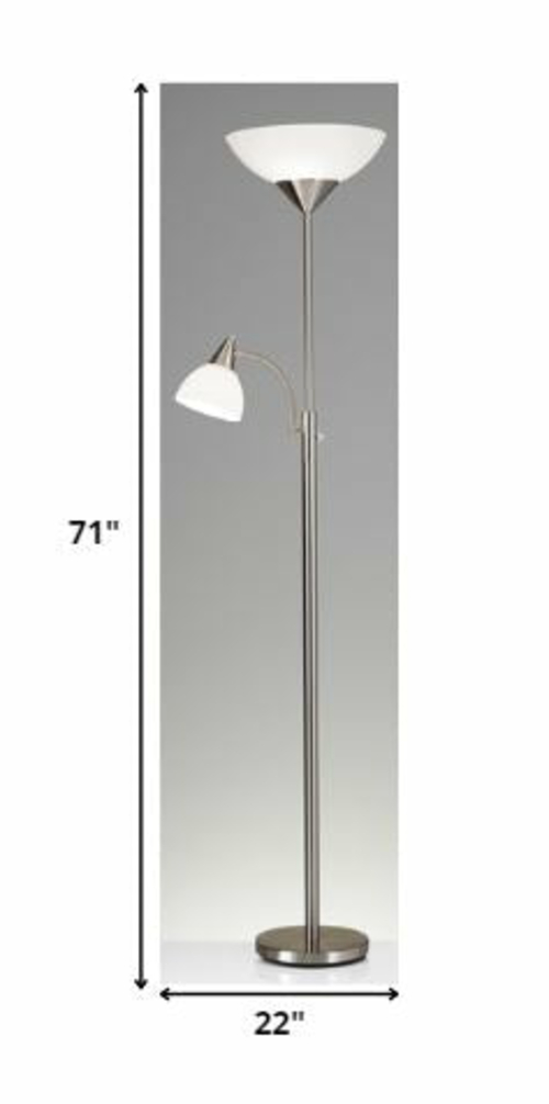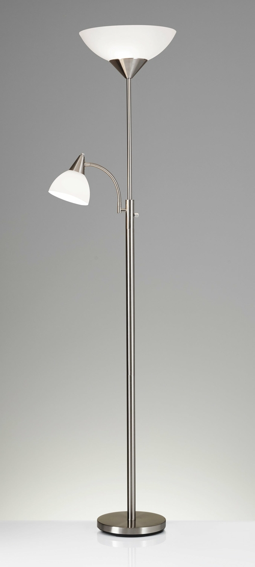 With its sleek black metal body and elegant white acrylic shades, this lamp is not only functional but also stylish. It fits seamlessly into various decor styles, from contemporary to traditional, making it a versatile addition to your home. Whether placed next to your favorite chair, in a corner of your living room, or beside your bed, the Torchiere Plus Chairside Floor Lamp enhances the aesthetic of any space.
