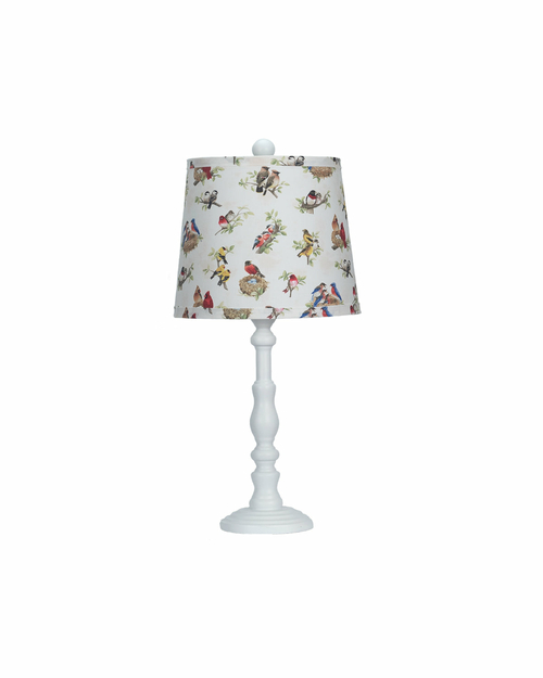 A white traditional table lamp featuring a charming birds printed shade, elegantly illuminating a cozy room.
