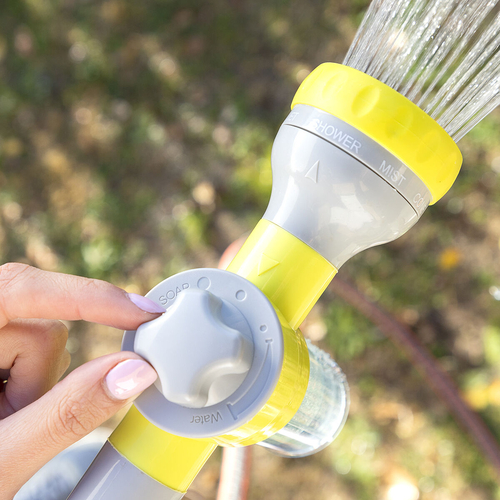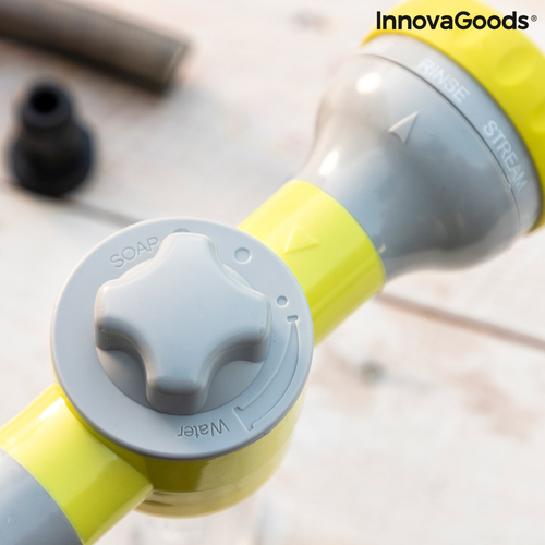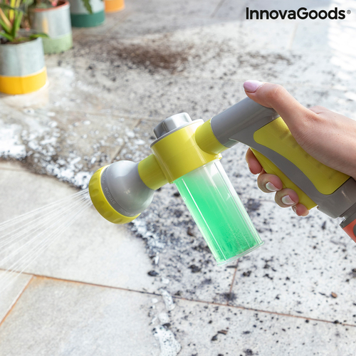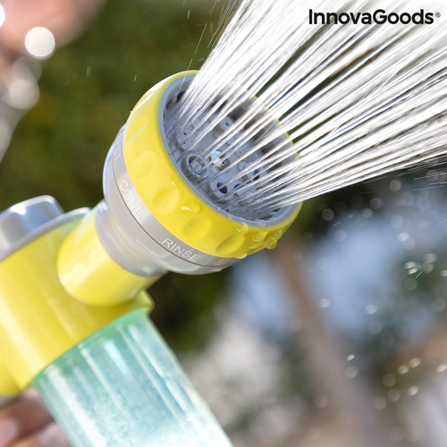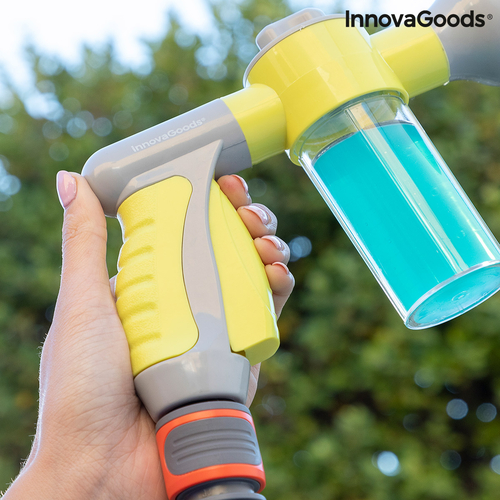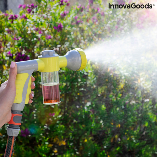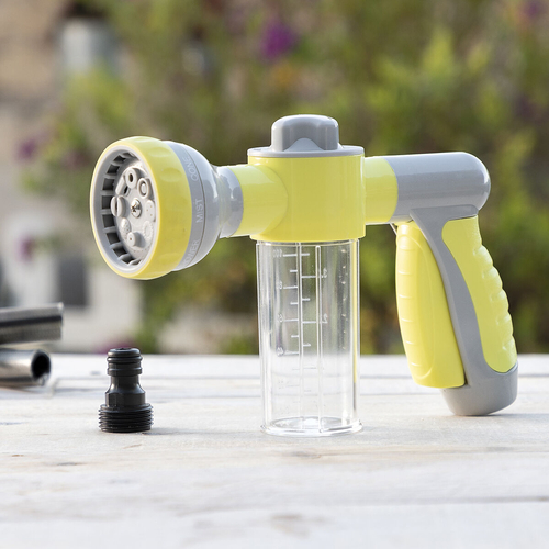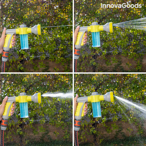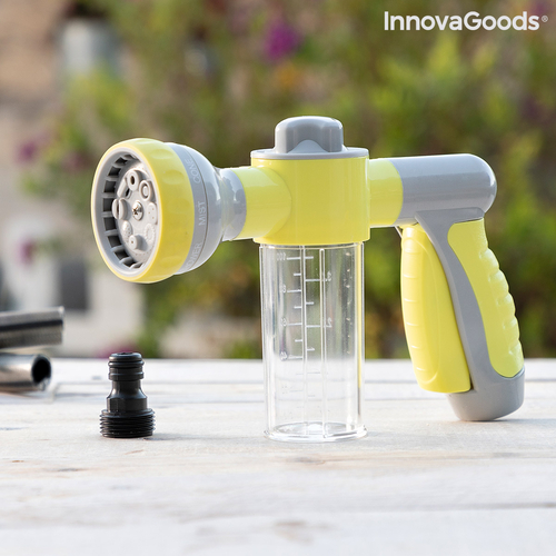 An original high pressure water gun for hosepipes which allows you to choose between 8 types of jet (pressure jet, precision jet, mist, rain, angled spray, horizontal spray, vertical spray, humidifier), depending on the use and requirements at any time and place. In addition, it features an integrated and removable tank with a capacity of 100ml to add soap or fertiliser. This versatile, multifunction and multipurpose water gun is extremely useful for watering and cleaning outdoors (garden, patio, terrace, etc.), saving time and effort. It provides a faster and more effective clean of walls, floors, windows, cars, bikes, barbecues, etc. As a watering pistol, it is perfect for watering gardens, plants, flowers, grass, trees, etc. It is very convenient and simple to use, it can be installed easily on any hosepipe and allows you to control the water pressure with the water jet selector. You can also select 3 dosing levels of the flow of soap or fertiliser from the tank, depending on whether you want a larger or smaller quantity mixed with the water. The handle is ergonomic and non-slip for a firm hold. The automatic trigger makes it easy to use, since the continuous water flow is activated with just one click and stops when you click it again. It includes a hose adapter (universal auto-click male connector). Hosepipe not included. It can only be used with water for watering or cleaning.