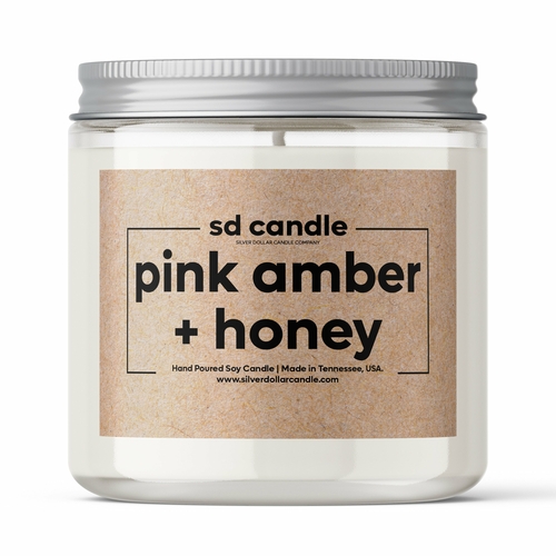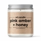A beautifully crafted Pink Amber + Honey scented candle in a small glass jar, showcasing its elegant design and inviting color.