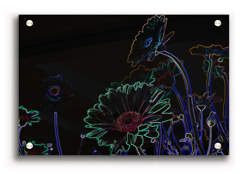 Abstarct Neon Floral 04 acrylic print featuring vibrant floral designs on 5mm thick acrylic glass, ready to hang.
