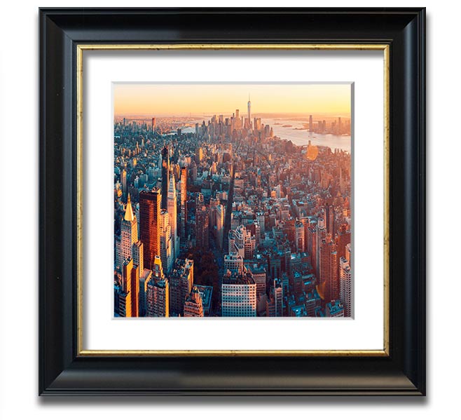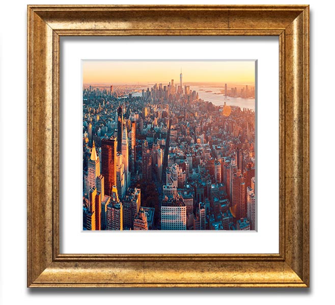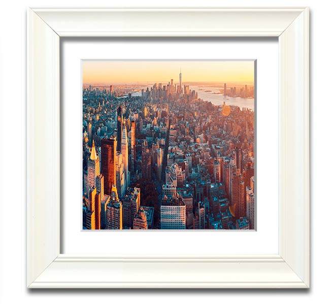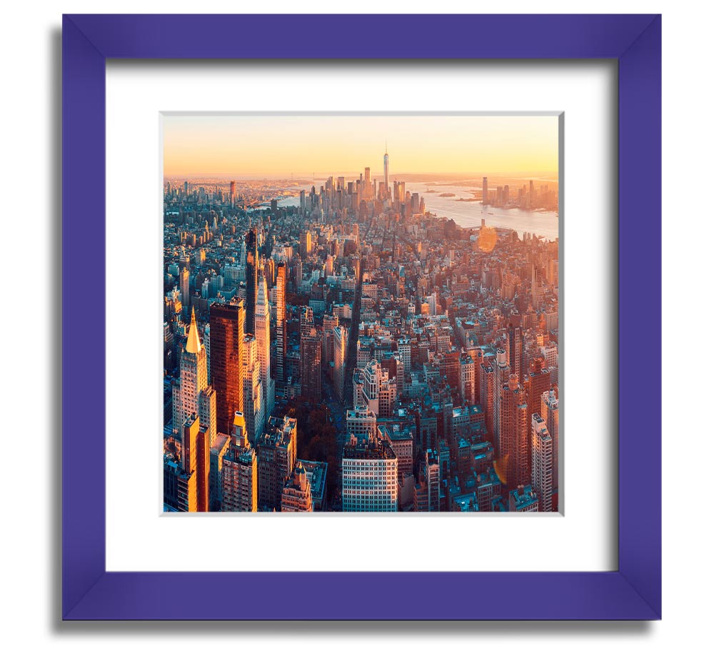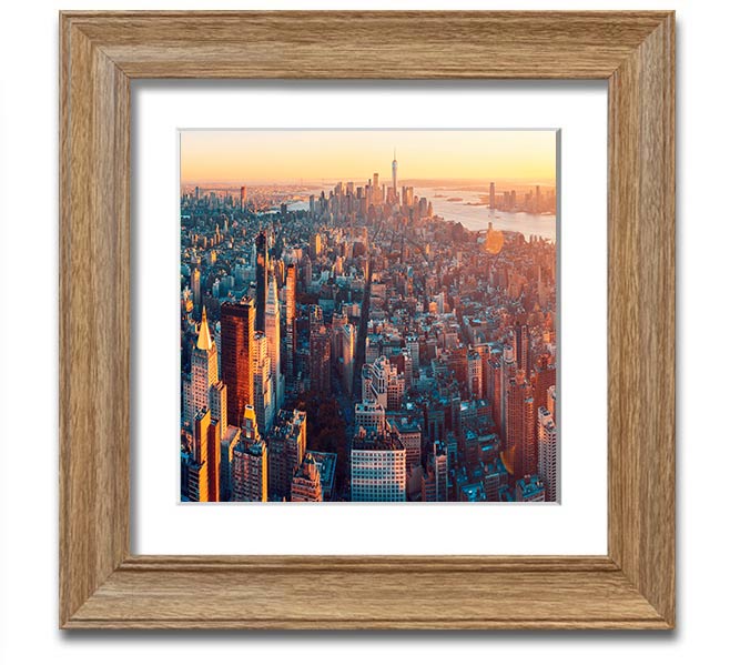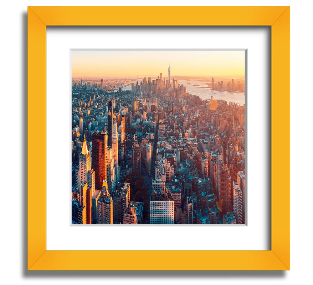 Aerial view of a city at sunset, framed in a stylish square frame, showcasing vibrant colors and intricate details.