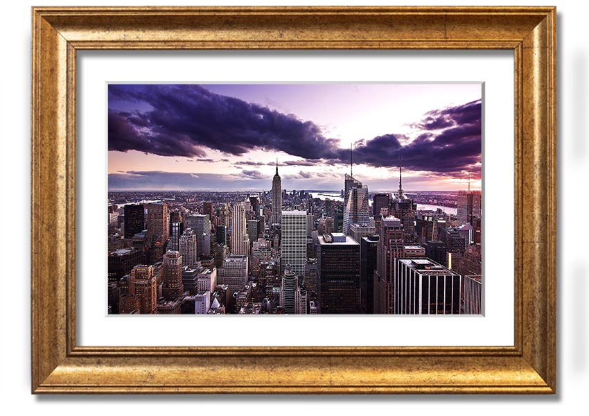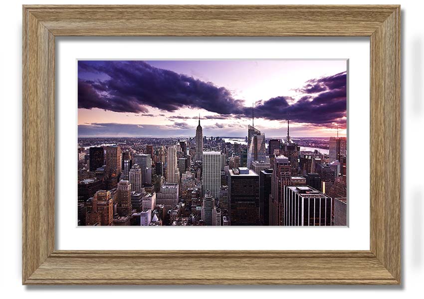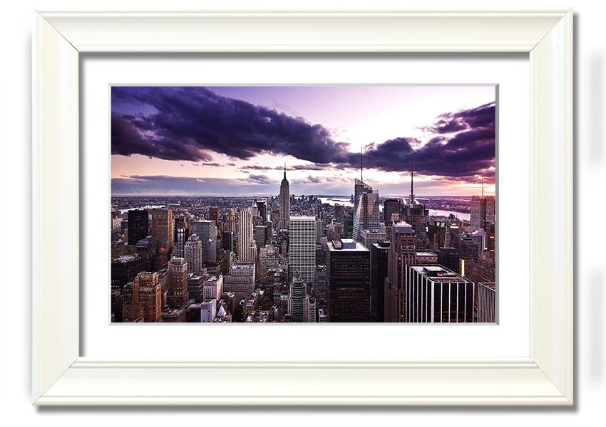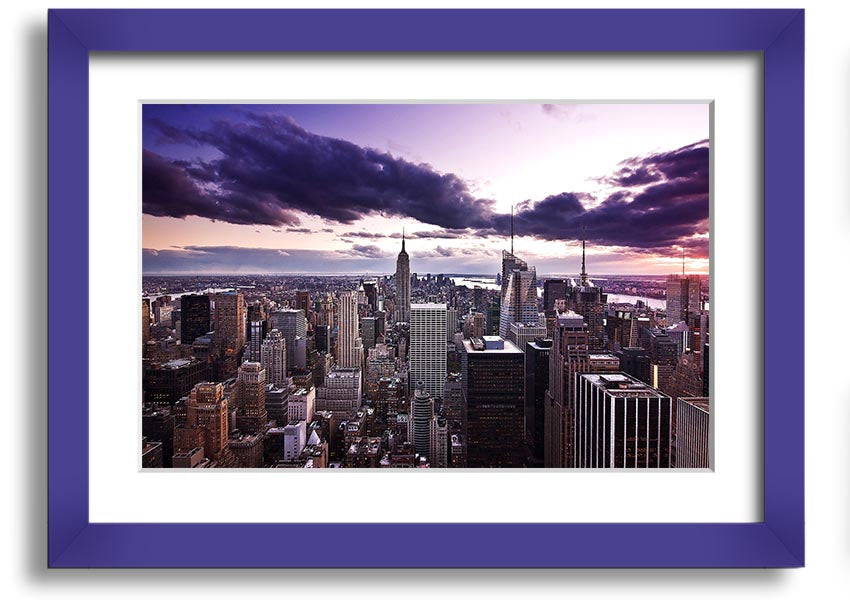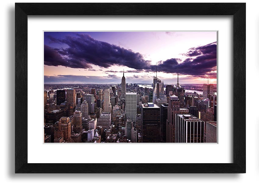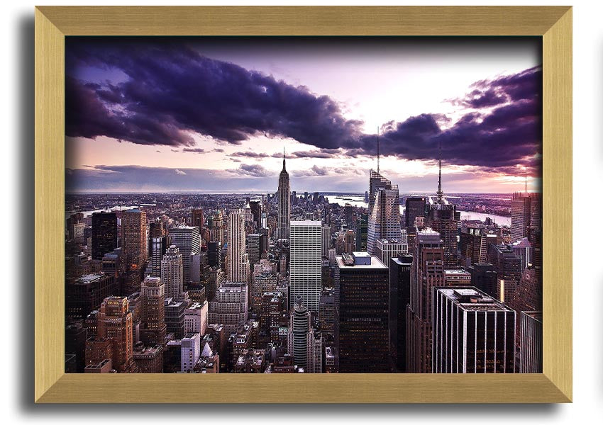 Experience the mesmerizing beauty of the Aerial View Of New York City At Dusk framed print. This stunning artwork captures the vibrant energy of New York City as the sun sets, casting a warm glow over the iconic skyline. Perfect for art lovers and city enthusiasts alike, this print is a fantastic addition to any home or office decor.