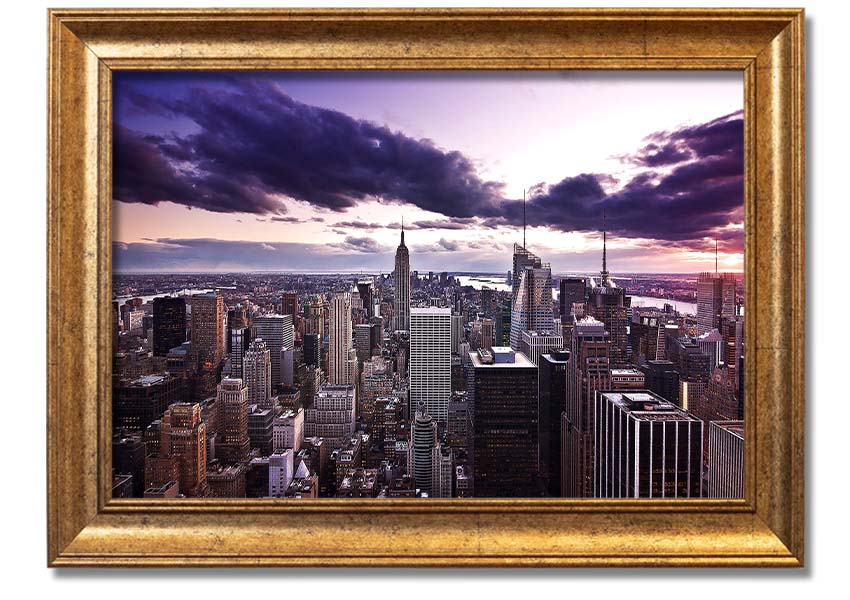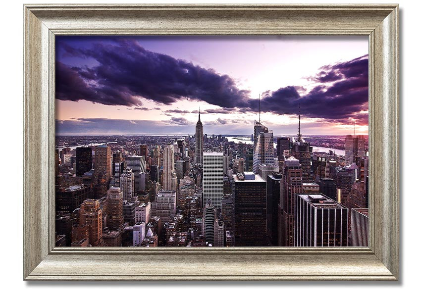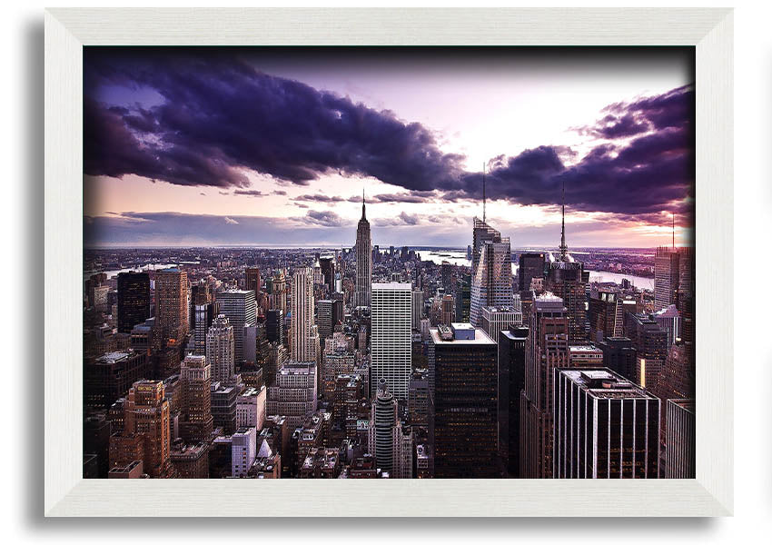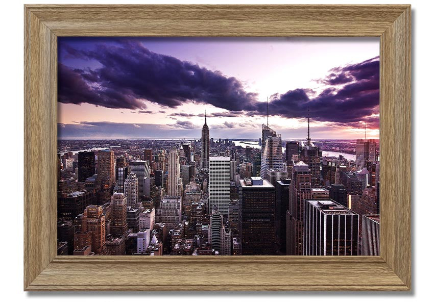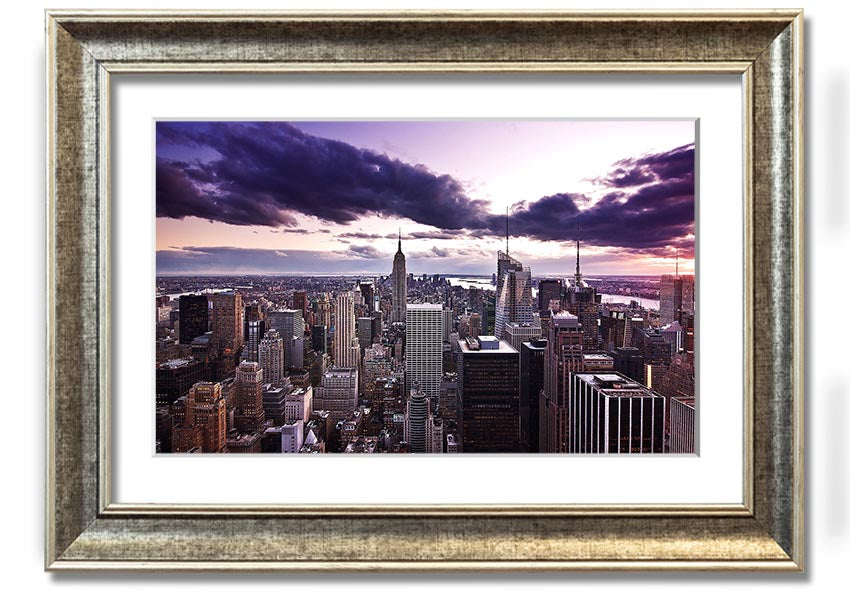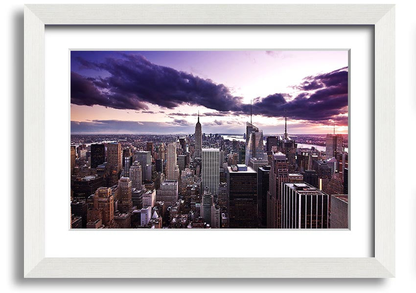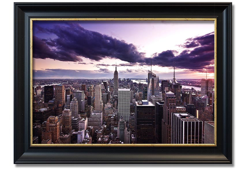 Experience the mesmerizing beauty of the Aerial View Of New York City At Dusk framed print. This stunning artwork captures the vibrant energy of New York City as the sun sets, casting a warm glow over the iconic skyline. Perfect for art lovers and city enthusiasts alike, this print is a fantastic addition to any home or office decor.
