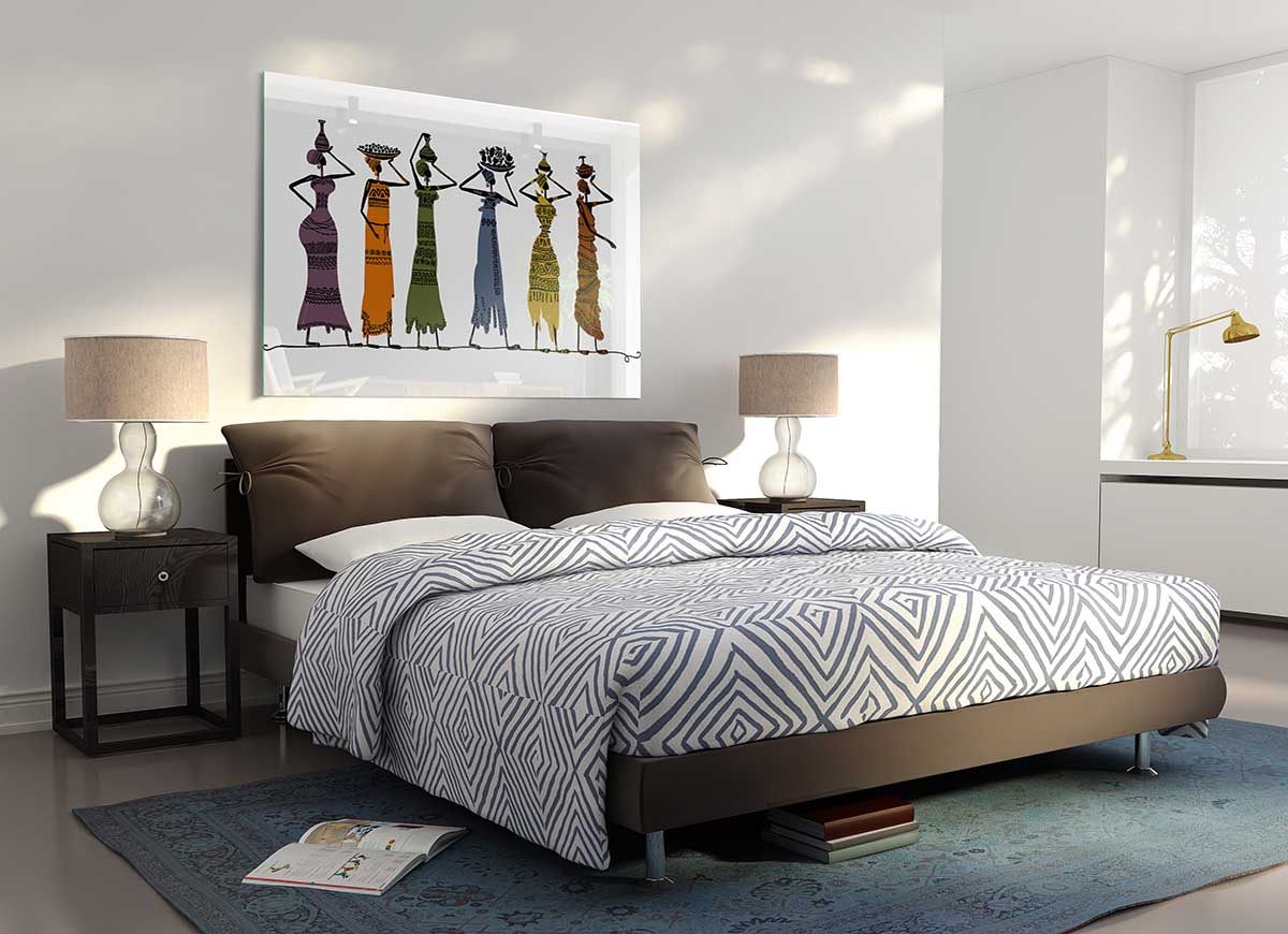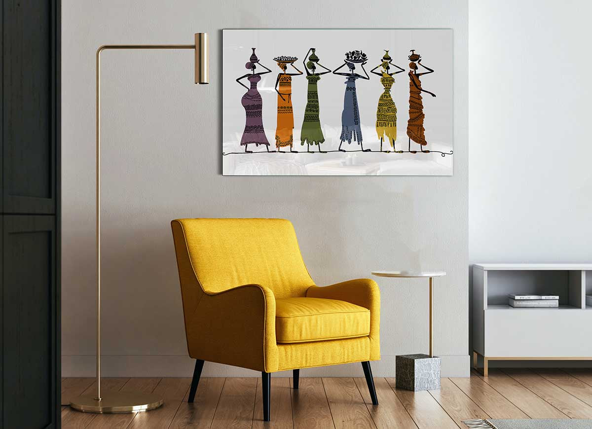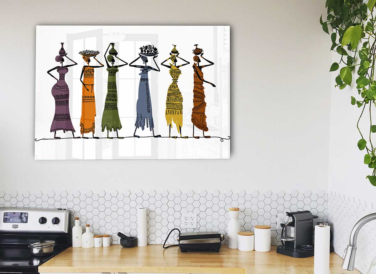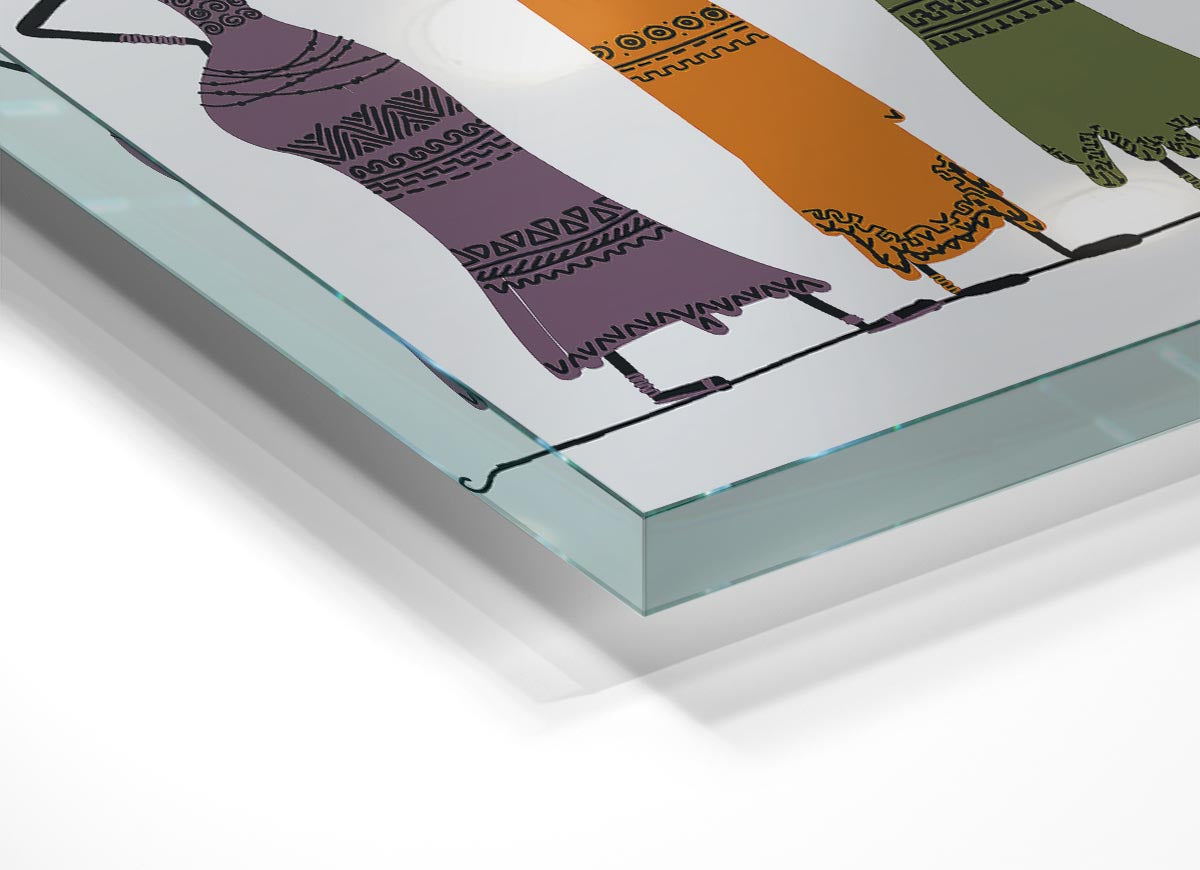 A vibrant glass print featuring African tribal art, showcasing intricate designs and colors.