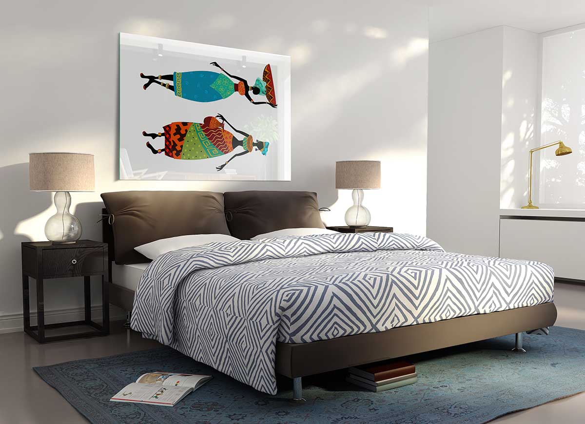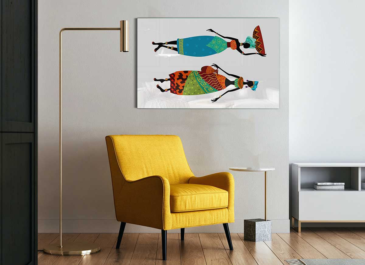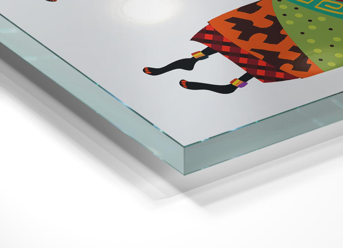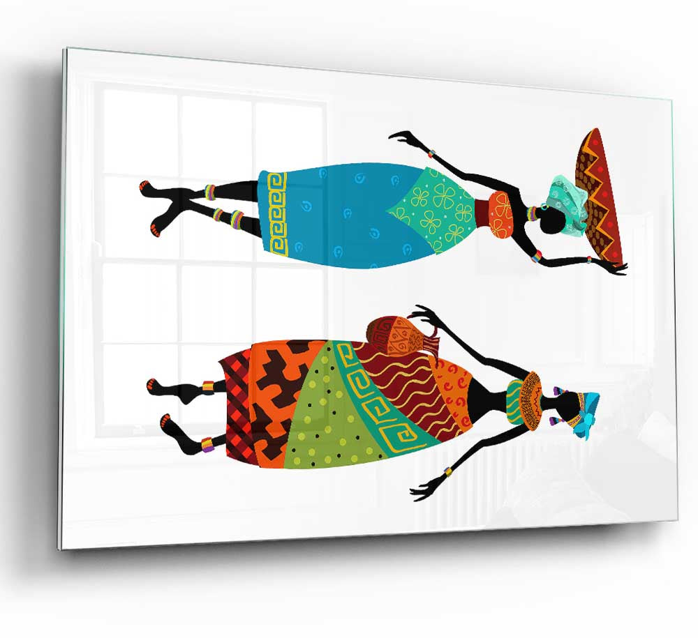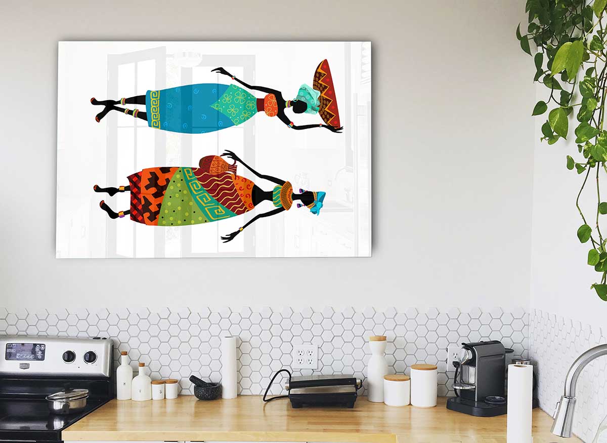 A vibrant glass print featuring African women, showcasing intricate details and colors, perfect for modern home decor.