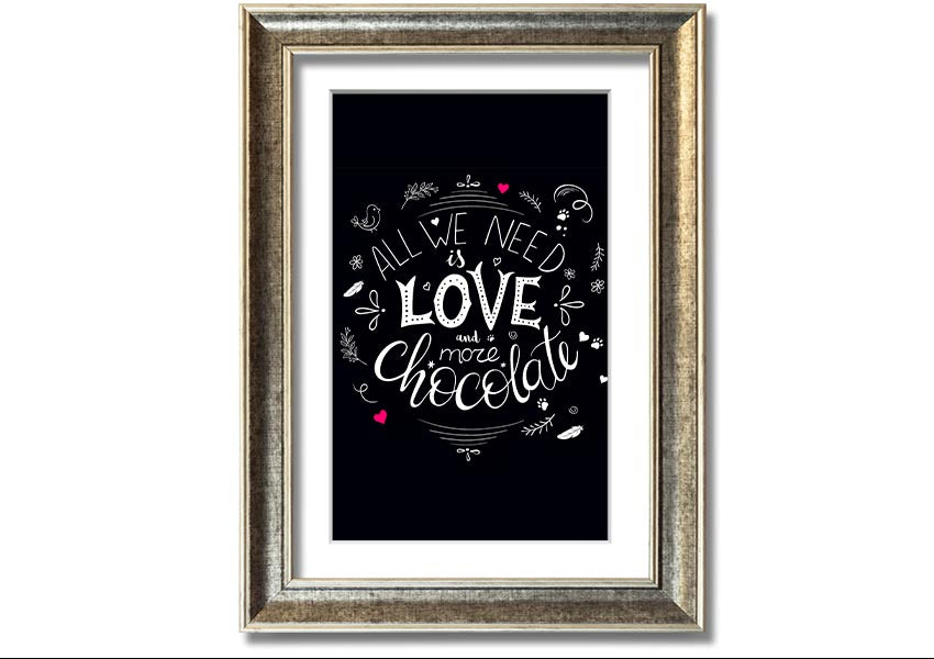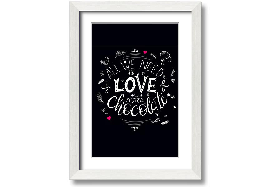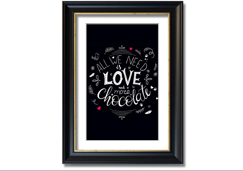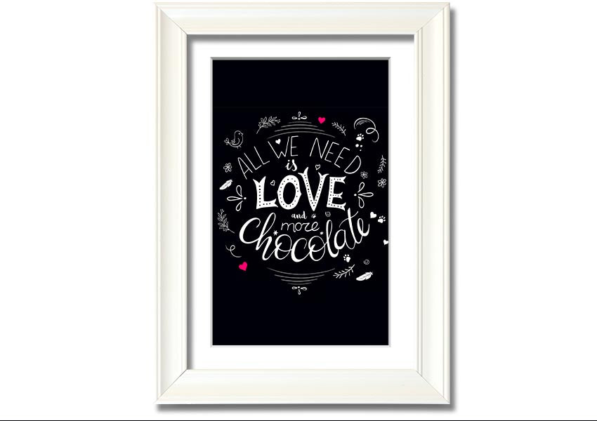 Introducing the delightful 'All You Need Is Love And More Chocolate' framed print, a perfect blend of love and indulgence that will brighten up any space. This charming piece of art is designed for those who appreciate the sweeter things in life, especially chocolate. Whether you are a chocolate lover yourself or searching for the ideal gift for a friend or loved one, this print is sure to bring a smile to anyone's face.