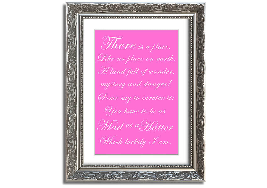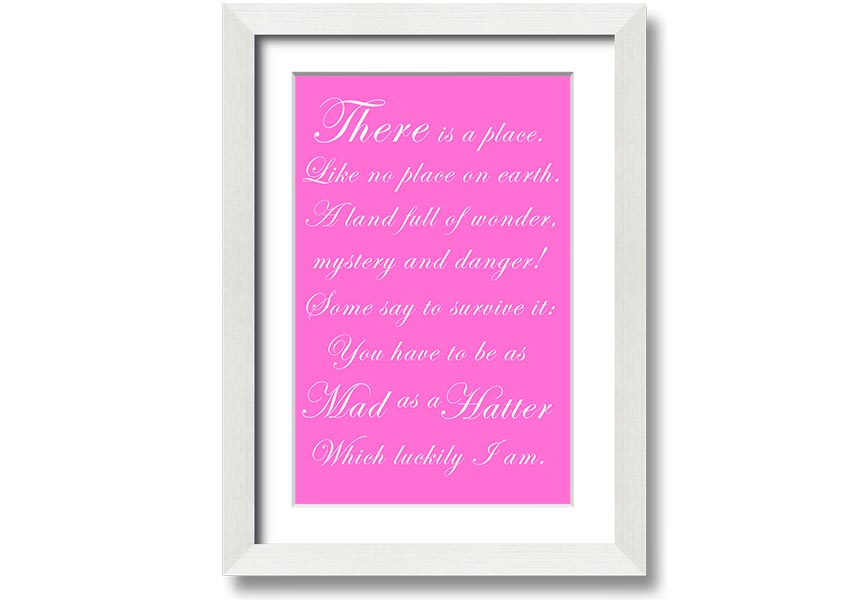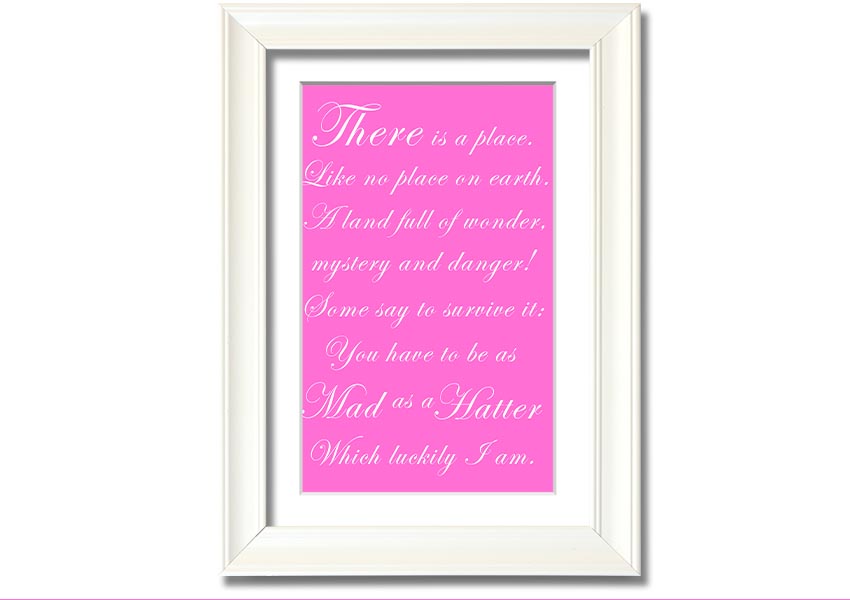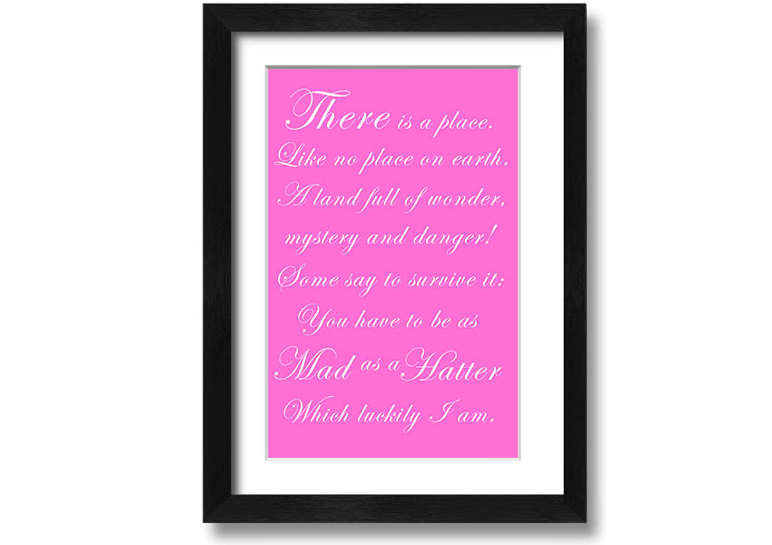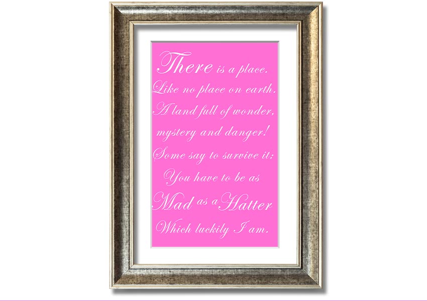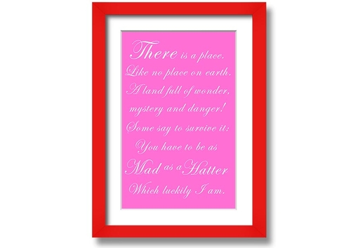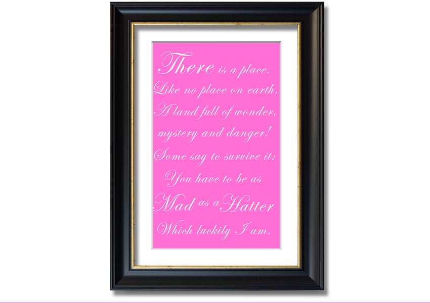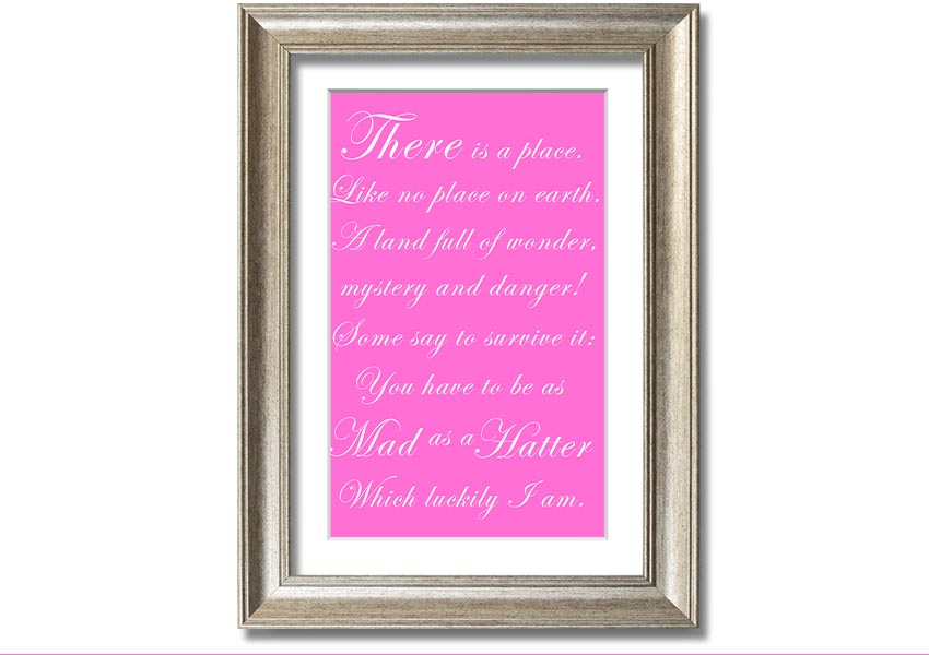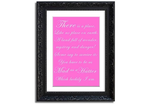 Introducing the stunning Alice In Wonderland As Mad As A Hatter Vivid Pink framed print, a delightful addition to any home or office space. This vibrant piece captures the whimsical essence of Lewis Carroll's beloved character, the Mad Hatter, in a striking pink hue that is sure to catch the eye of any visitor. Whether you're an avid fan of the classic tale or simply looking to add a pop of color to your decor, this print is the perfect choice.