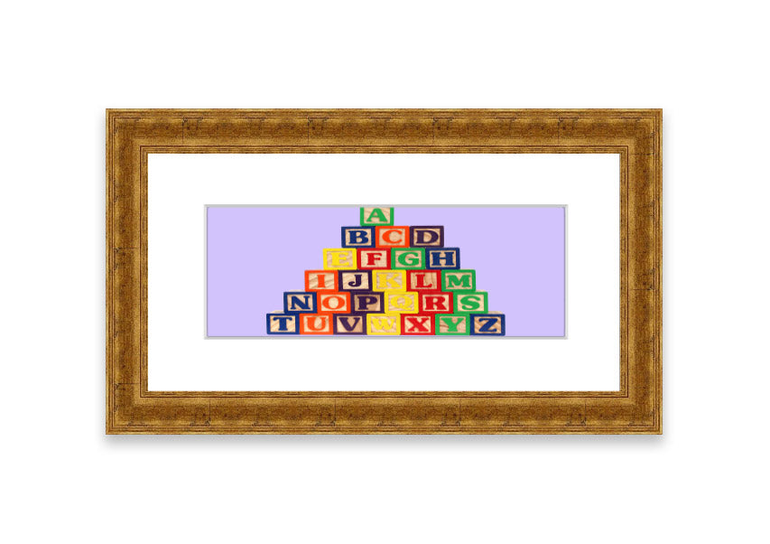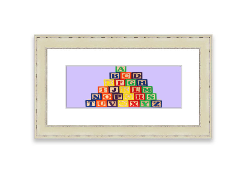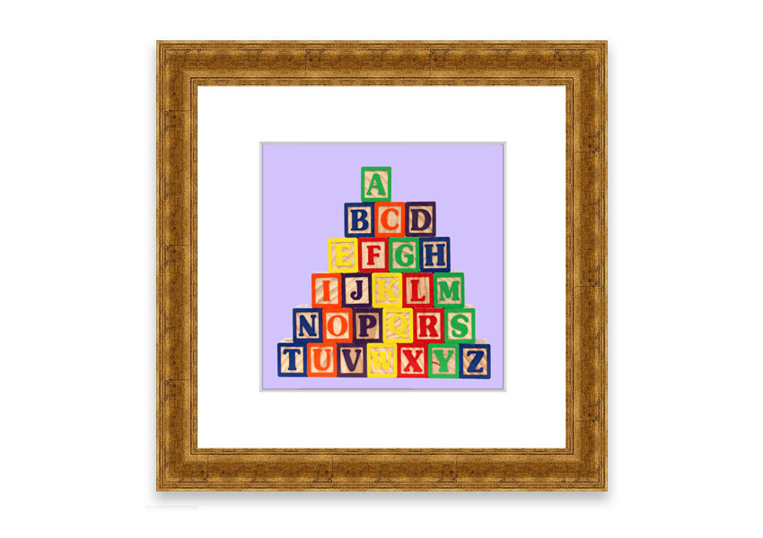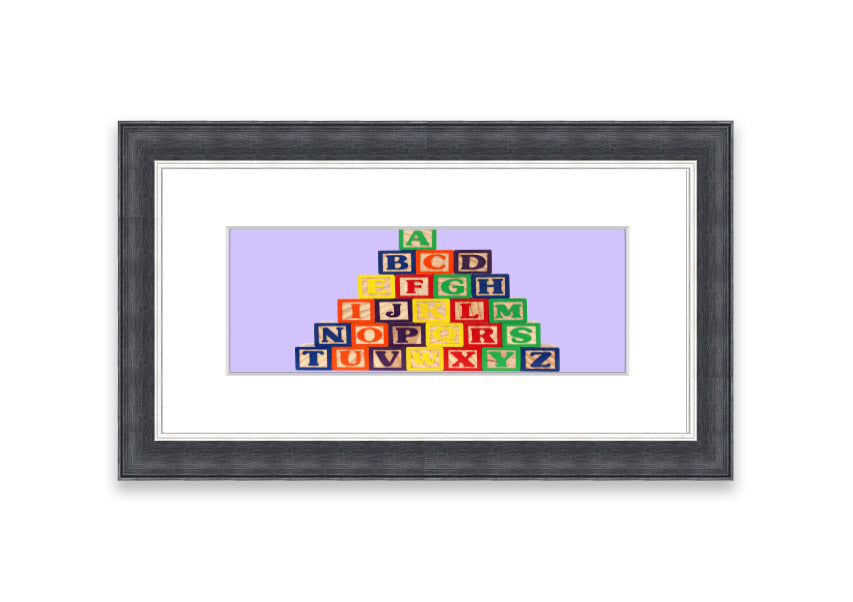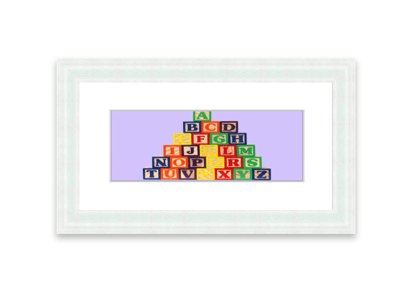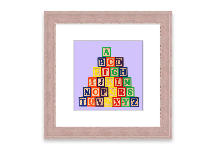 This framed print is available in a variety of frame colors, allowing you to choose the perfect match for your existing decor. Whether you prefer a classic black frame, a bright white finish, or something more colorful, there is an option to suit every taste and style. This versatility makes it easy to incorporate the Alphabet Blocks Lilac print into any room.