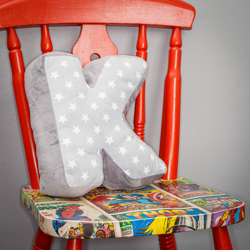 Available in the full alphabet and also & , Alphabet Letter Cushions feature a unisex star design with contrast sides and are perfect for all ages, they’re extremely soft and comfortable, a real talking point. Whether your decorating a nursery, bedroom , living room or playroom these cushions add a splash of personality with your initials, childrens’ or loved ones’