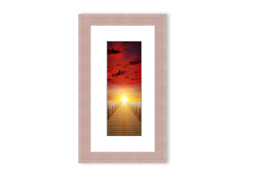 Framed print of a sunset over a boardwalk, showcasing vibrant colors and serene scenery, available in multiple frame options.