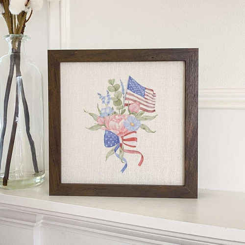 The American Flag Bouquet framed sign features a stylish wood frame that is available in two elegant finishes: walnut and white-washed. This allows you to choose the perfect match for your existing decor. The natural, linen-style appearance of the sign adds a touch of rustic charm, making it suitable for both modern and traditional interiors.