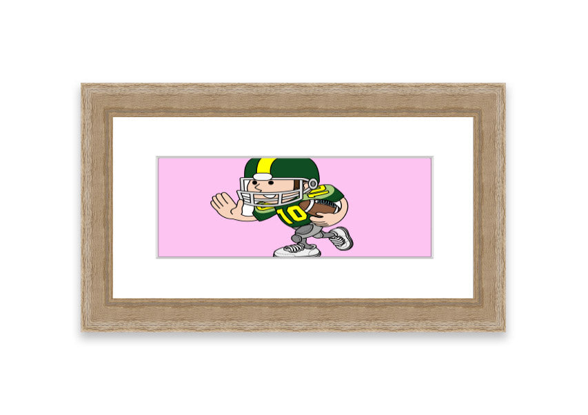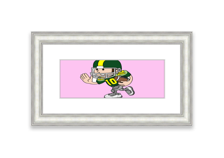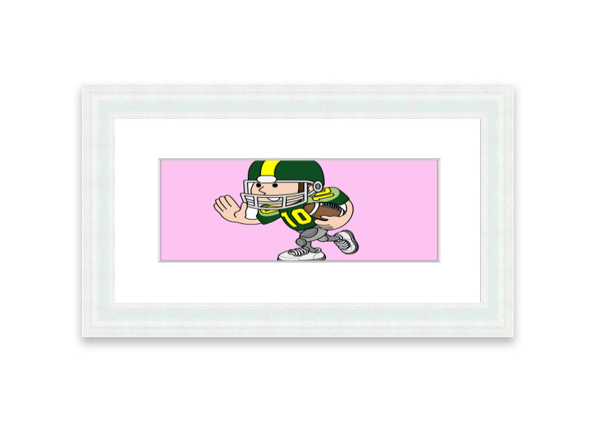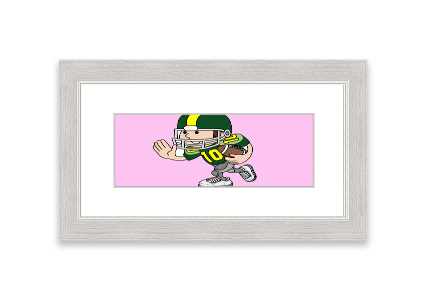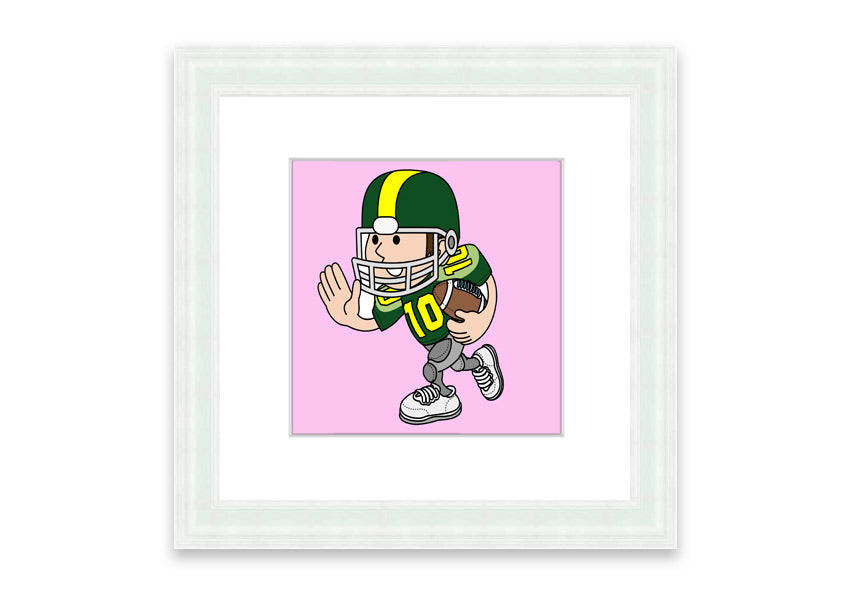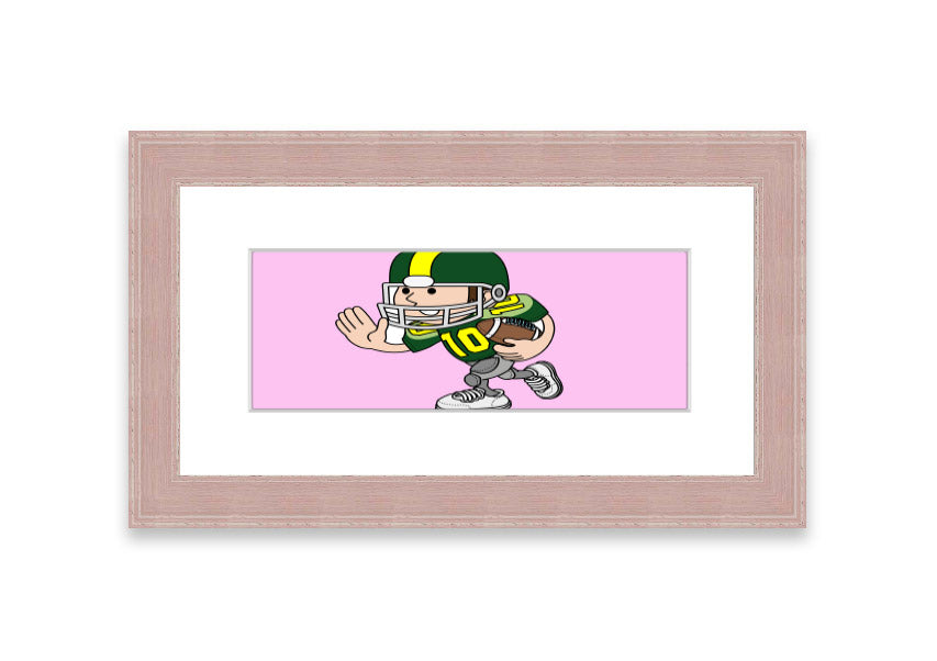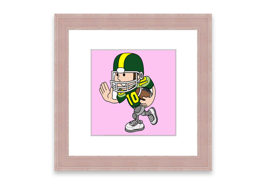 Framed print of an American football player in pink, showcasing dynamic action and vibrant colors.