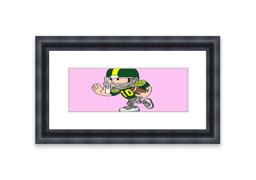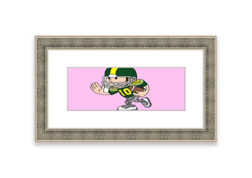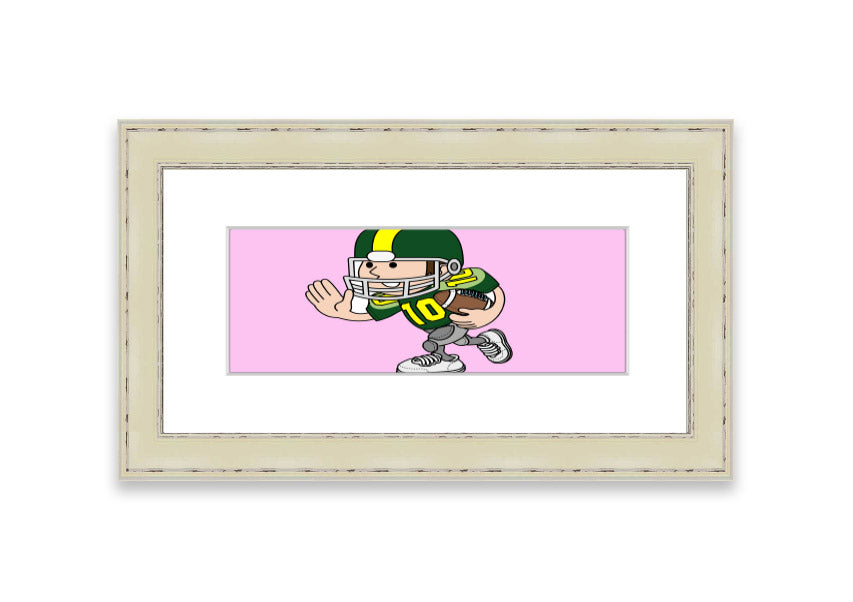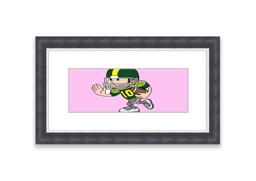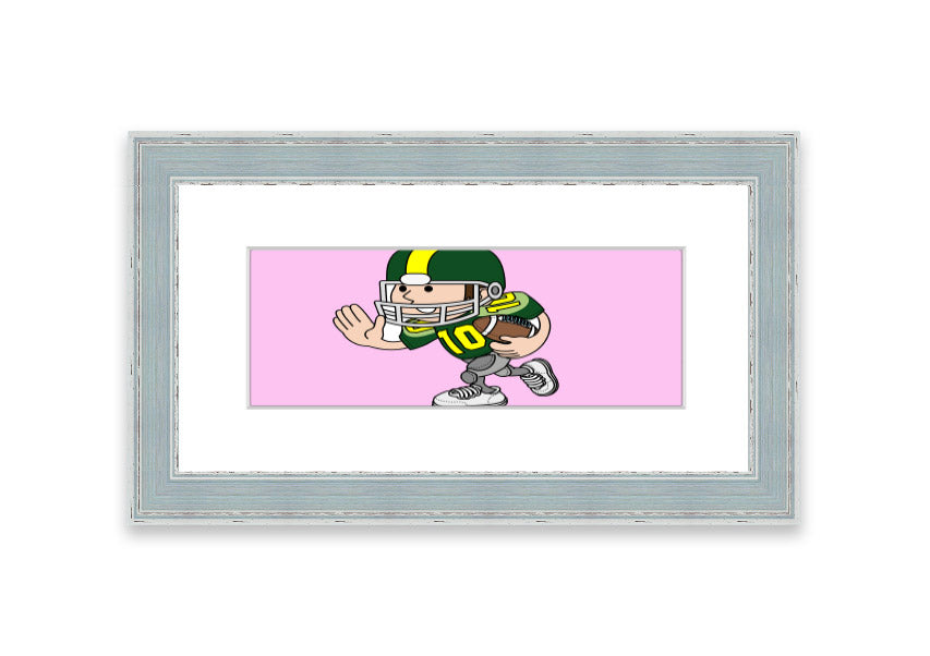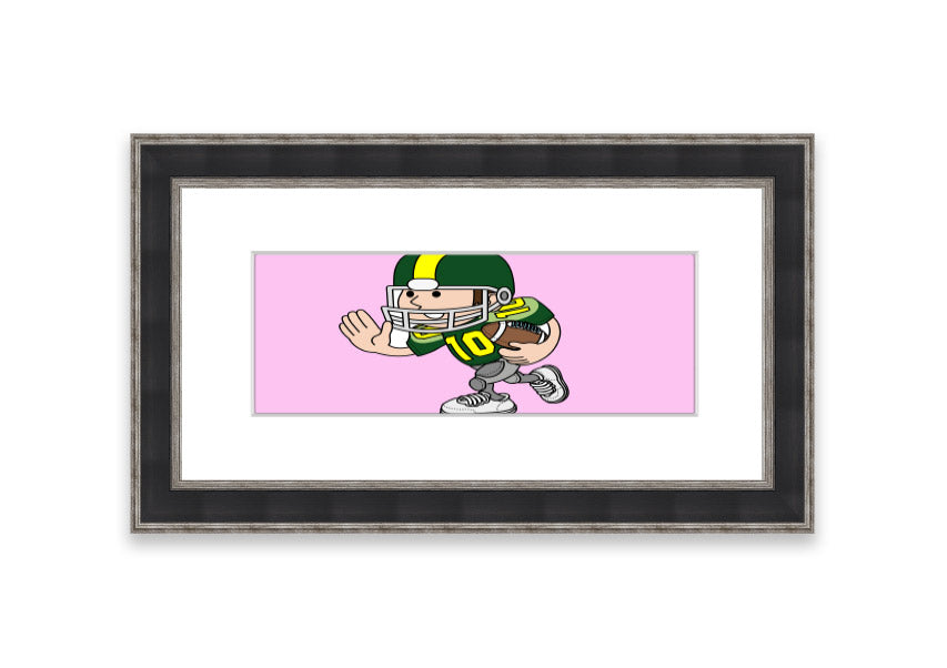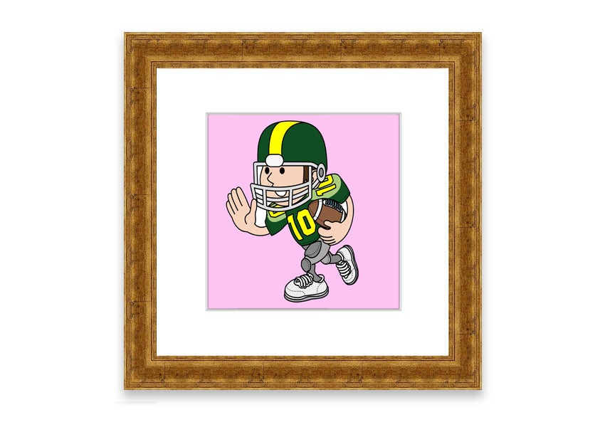 Framed print of an American football player in pink, showcasing dynamic action and vibrant colors.