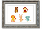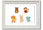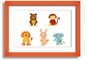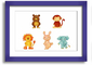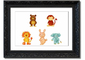 A colorful framed print featuring playful animal designs, handmade in the UK, available in various frame colors.