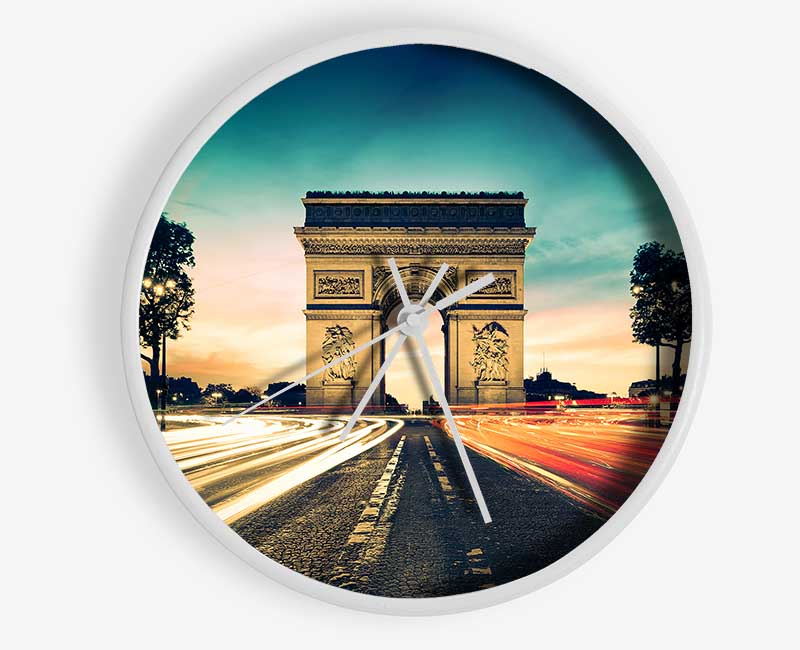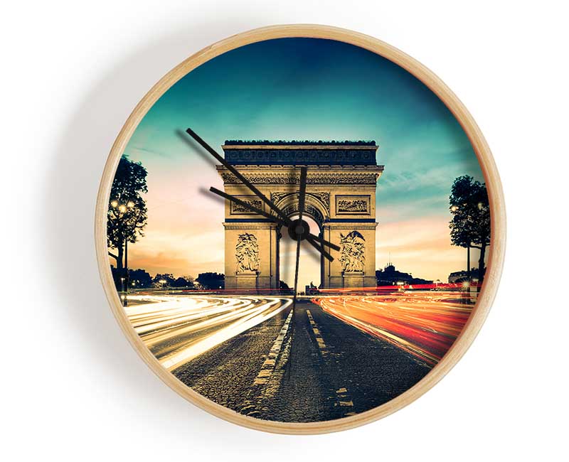 Arc De Triomphe 9 clock made from natural bamboo with a round face, available in black, white, and natural frame colors.