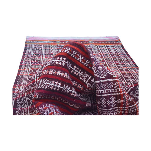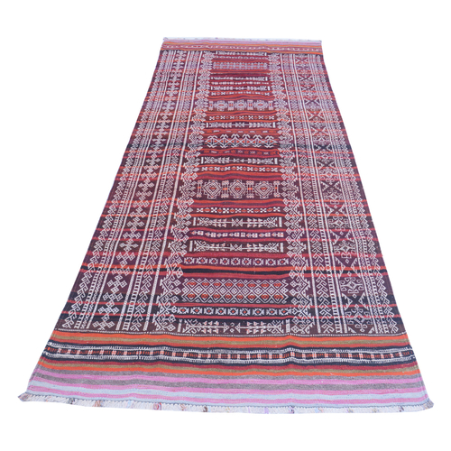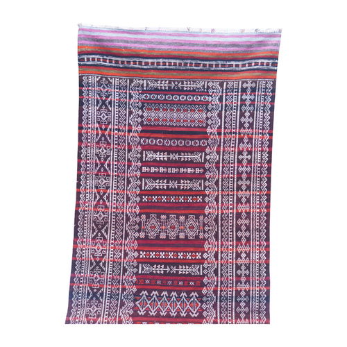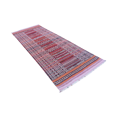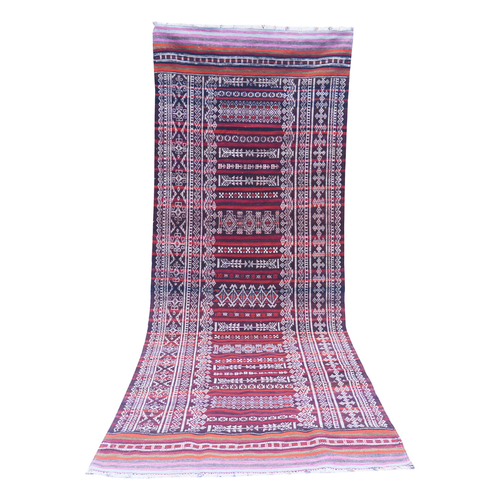 Balochi or Baluch Kilims are traditional tribal rugs that are made in the wider area of Baluchistan on the west of Pakistan and bordering with Afghanistan. Balochi Soumak kilims often present geometric motifs and tribal designs. These are embroidered to present a gift on special events like marriages. Initially, they were made for the use in nomadic tribes inside the tribal tents. All of the vintage rugs has been restored by craftsmen. Wear and tear from past gives a unique look. These vintage red rug can be used at entrance or can be used in smaller spaces; they would fit very nicely in a traditional or minimalistic settings.
