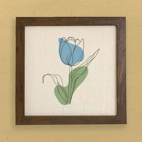 A beautifully framed sign featuring a hand-drawn blue tulip design on a neutral linen-look background, available in walnut or white-washed frame.