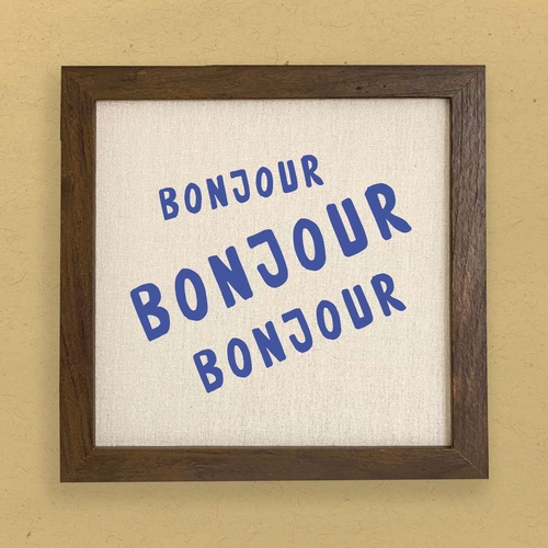 Bonjour Trois Framed Sign with a stylized wood frame, featuring eco-friendly printing on a linen-look background.