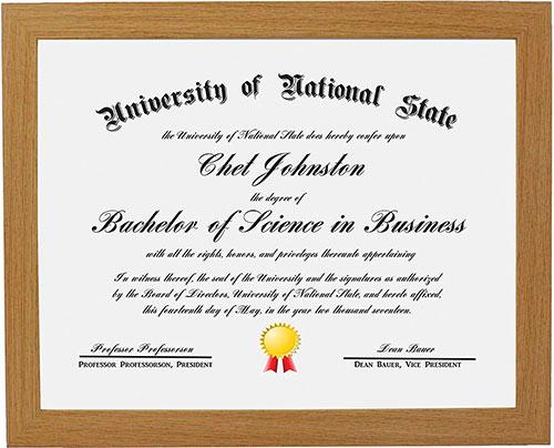 Elegant Certificate and Document Frame with wide molding, showcasing a diploma and featuring a natural oak finish.