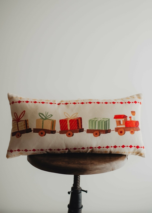 The front of the pillow cover features a delightful toy train carrying individual wrapped presents against a cream background. This charming design is sure to evoke feelings of nostalgia and excitement, making it a perfect accent for your holiday gatherings. The back of the pillow cover is a solid cream color, providing a versatile look that complements various decor styles.