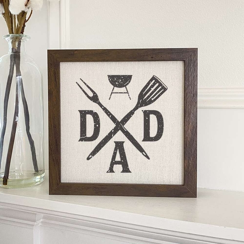 Introducing the Dad Spatula Fork - Framed Sign, a charming addition to any kitchen or dining area. This beautifully crafted sign features a stylized wood frame that is both functional and decorative. Measuring 9" x 9" x 1.5", it is the perfect size to sit on a shelf or mantle, or to be hung on a wall, making it a versatile piece for your home decor.