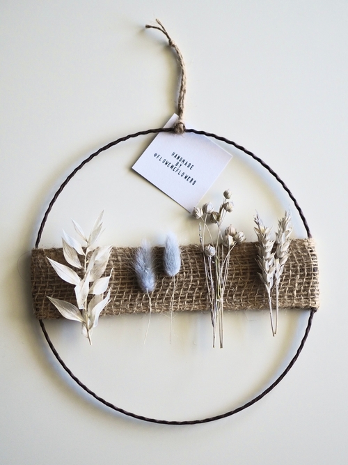 A metal ring in wrapped with jute ribbon and decorated with beautiful dried flowers. This dried flower wreath gives every room a very special atmosphere. Suitable for wall or window. Suitable for all seasons. Four different color options available: white, brown, pink and blue. The ring has a diameter of 20 cm and is provided with a cord for hanging. You can hang the wreath directly in a dry place protected from direct sunlight. Not suitable for outdoor use.