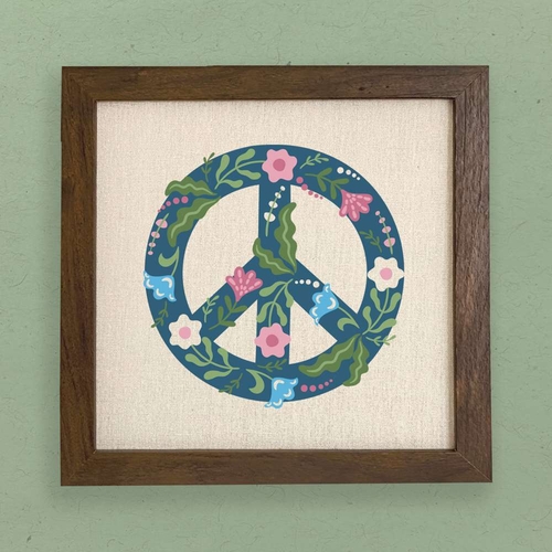 Our Floral Peace Sign is framed in a stylish wood frame that is available in two elegant options: walnut and white-washed. This allows you to choose the perfect frame that complements your existing decor. The frame is wide enough to stand on its own, providing a sturdy base for display on any flat surface. The natural, linen-style appearance of the sign adds a touch of sophistication and warmth to your space.