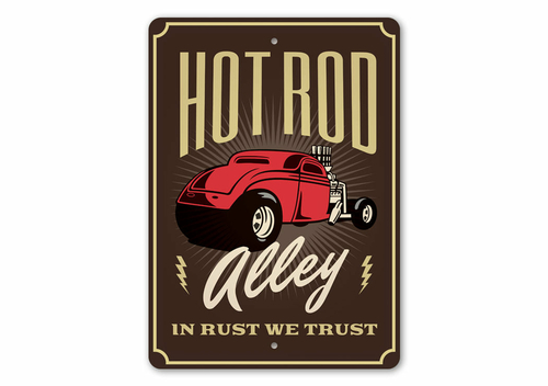 In summary, the Hot Rod Alley - In Rust We Trust Garage Sign is more than just a decorative item; it’s a celebration of automotive culture. With its high-quality materials, customization options, and easy installation, it’s the perfect addition to any garage or man cave. Don’t miss out on the opportunity to own this unique piece of art that reflects your passion for cars.