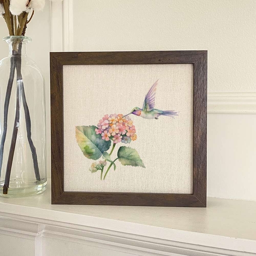 A beautifully framed sign featuring a hummingbird and lantana flowers, with a natural linen-style background and a stylish wood frame.
