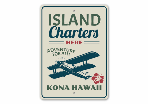 Island Charters Aviation Sign made of high-quality aluminum, featuring customizable text and pre-drilled holes for easy mounting.