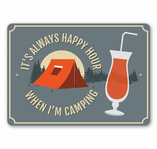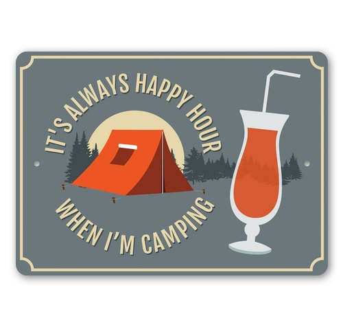 Transform your camping adventures with our delightful 'It's Always Happy Hour When Im Camping' sign. This decorative piece is not just a sign; it's a statement that brings joy and laughter to your outdoor experiences. Crafted from premium aluminum, this sign is designed to withstand the elements, ensuring that it remains a cherished part of your camping gear for years to come.