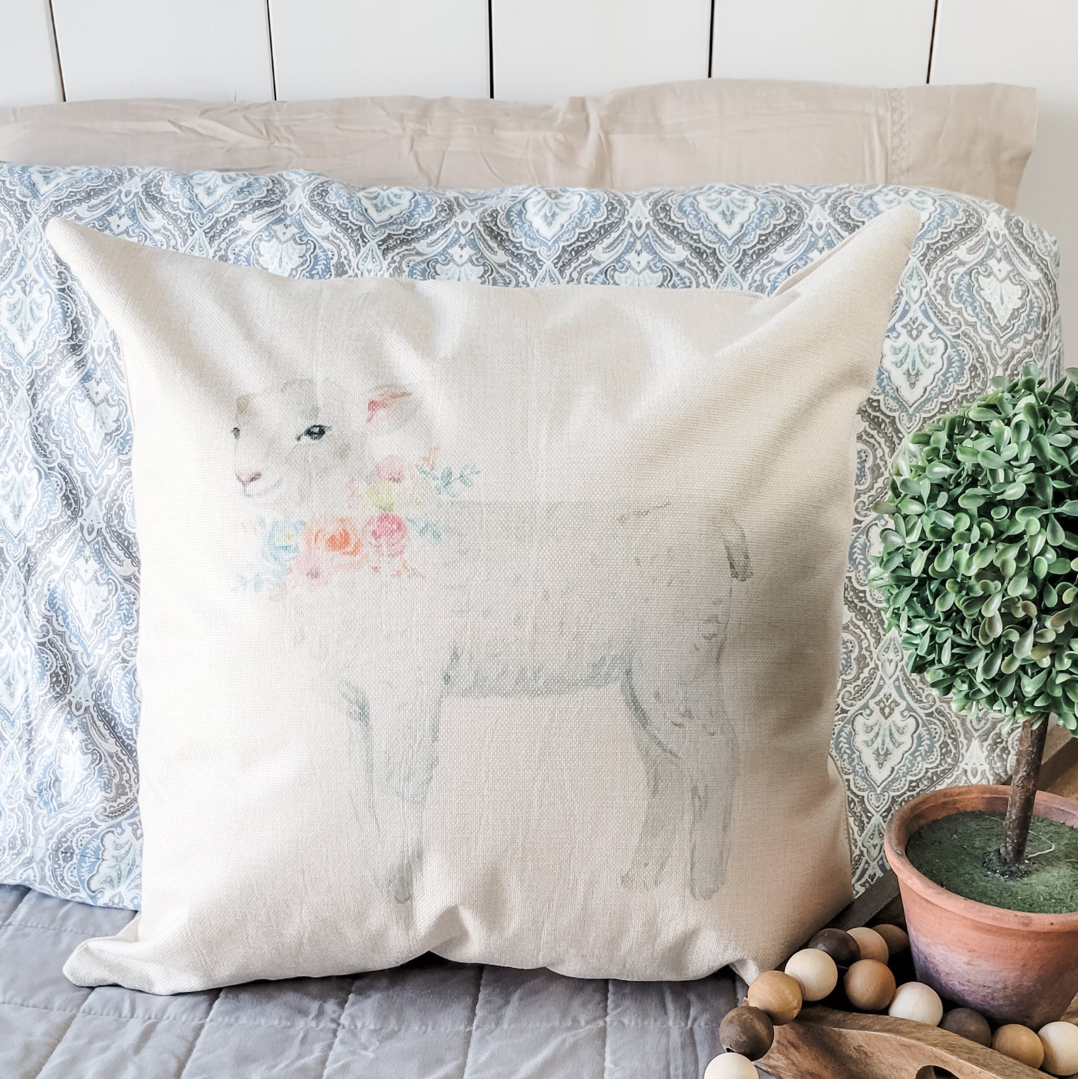 The Lamb Pillow Cover is available in two beautiful base colors: farmhouse beige and satin white. These neutral tones complement a variety of decor styles, from rustic farmhouse to modern chic. Choose the color that best fits your home’s aesthetic and enjoy the added charm it brings.
