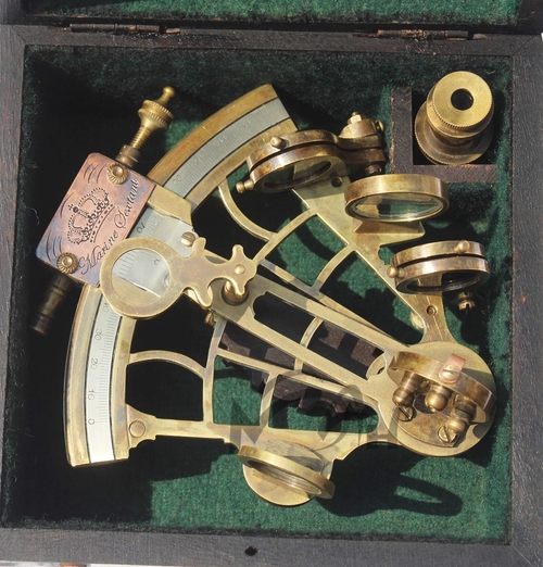 Brass Ship Sextant - J SCOTT LONDON -1753- A sextant is an instrument used to measure the angle between any two visible objects. Its primary use is to determine the angle between a celestial object and the horizon which is known as the altitude. Making this measurement is known as sighting the object, shooting the object, or taking a sight. The angle, and the time when it was measured, can be used to calculate a position line on a nautical or aeronautical chart. A common use of the sextant is to sight the sun at noon to find one's latitude. Its all parts are moving, can be used for basic observation or suitable for collectors and can be a gift for someone. Size: - 12.5cm - L x 11cm - W x 6cm - H (Sextant) Weight - 450 Gms. 14.5cm - L x 14.5cm - W x 8.2cm - H (Wooden Box) Weight - 550 Gms. Total Weight - 1 kg. BRAND-MAH