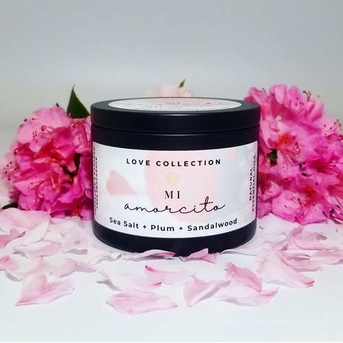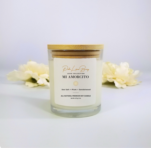 Introducing "Mi Amorcito" All Natural Premium Soy Scented Candle: A fragrance inspired by Perla's husband, a true testament to love. The phrase "Mi Amorcito" or "My Sweetheart" is an affectionate term in Spanish used to express care for someone special in your life. Our hand-poured, all-natural premium soy candle offers a captivating scent with salty oceanic accords mixed with plum, dark musk and sandalwood notes. Indulge in the luxurious and profound aroma that fills your space with an airy fragrance.