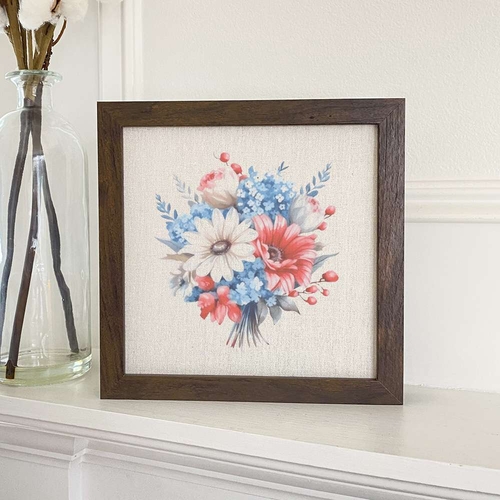 Introducing the Patriotic Daisy Bouquet - Framed Sign, a stunning addition to your home decor that beautifully combines artistry and patriotism. This charming sign features a stylized wood frame that is not only wide enough to set on a shelf or mantle but can also be hung on a wall, making it a versatile piece for any room. Crafted with care, this sign is printed in the USA using eco-friendly inks on a neutral linen-look background, ensuring that it is both stylish and environmentally conscious.
