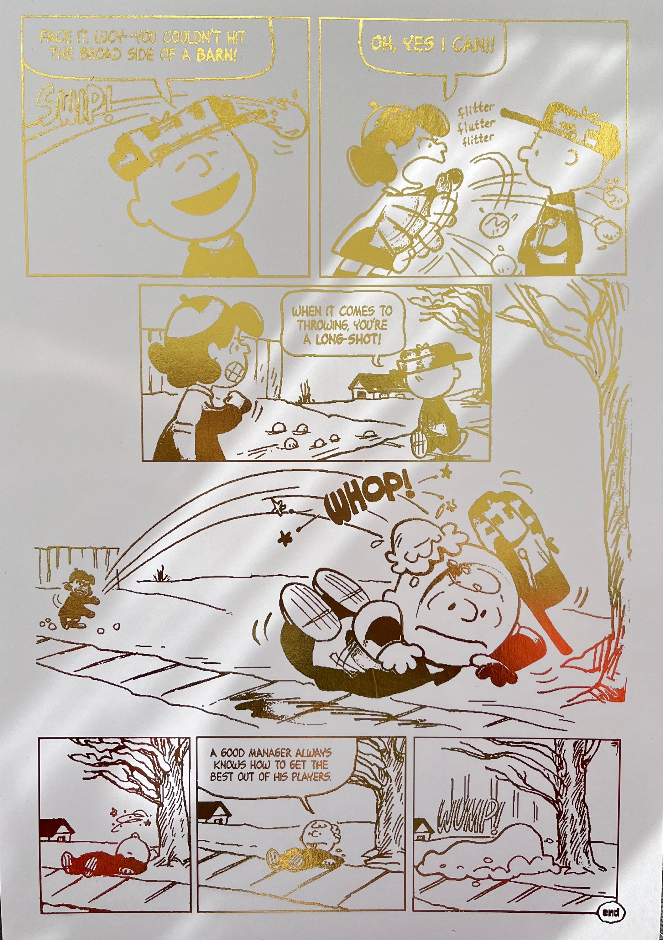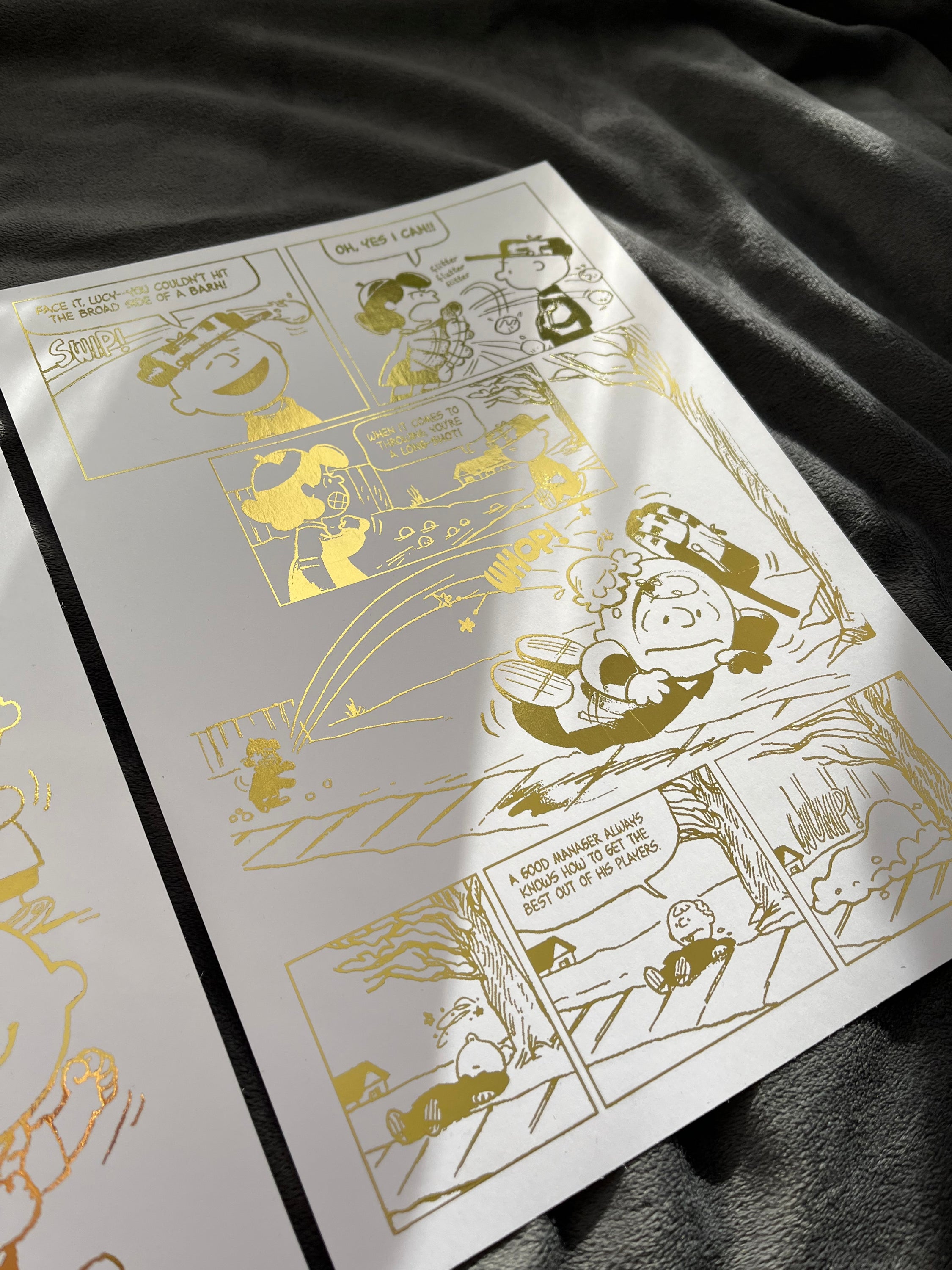 In this enchanting comic set, you will find the beloved characters that have entertained readers for generations. From the ever-optimistic Charlie Brown to the imaginative Snoopy, and the feisty Lucy to the thoughtful Linus, each character is depicted with care and attention to detail. The gold foil accents add a touch of elegance, making these prints not just art, but a celebration of the timeless stories and friendships that define Peanuts.