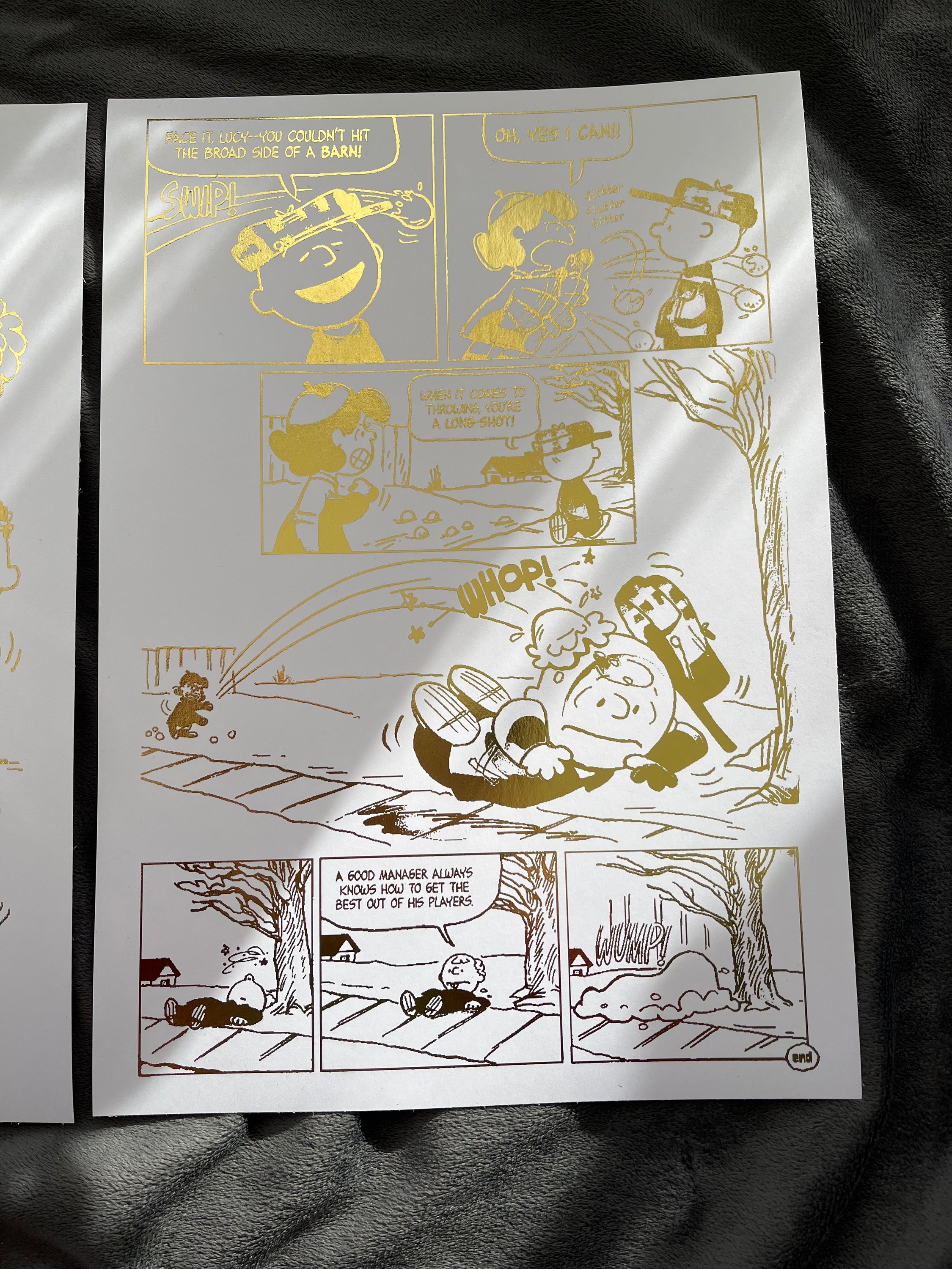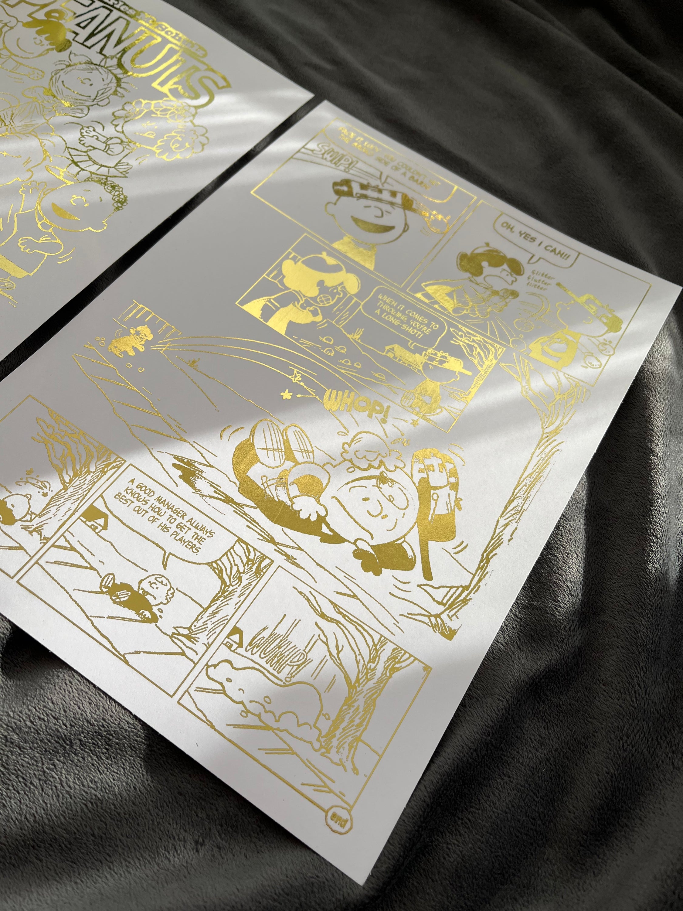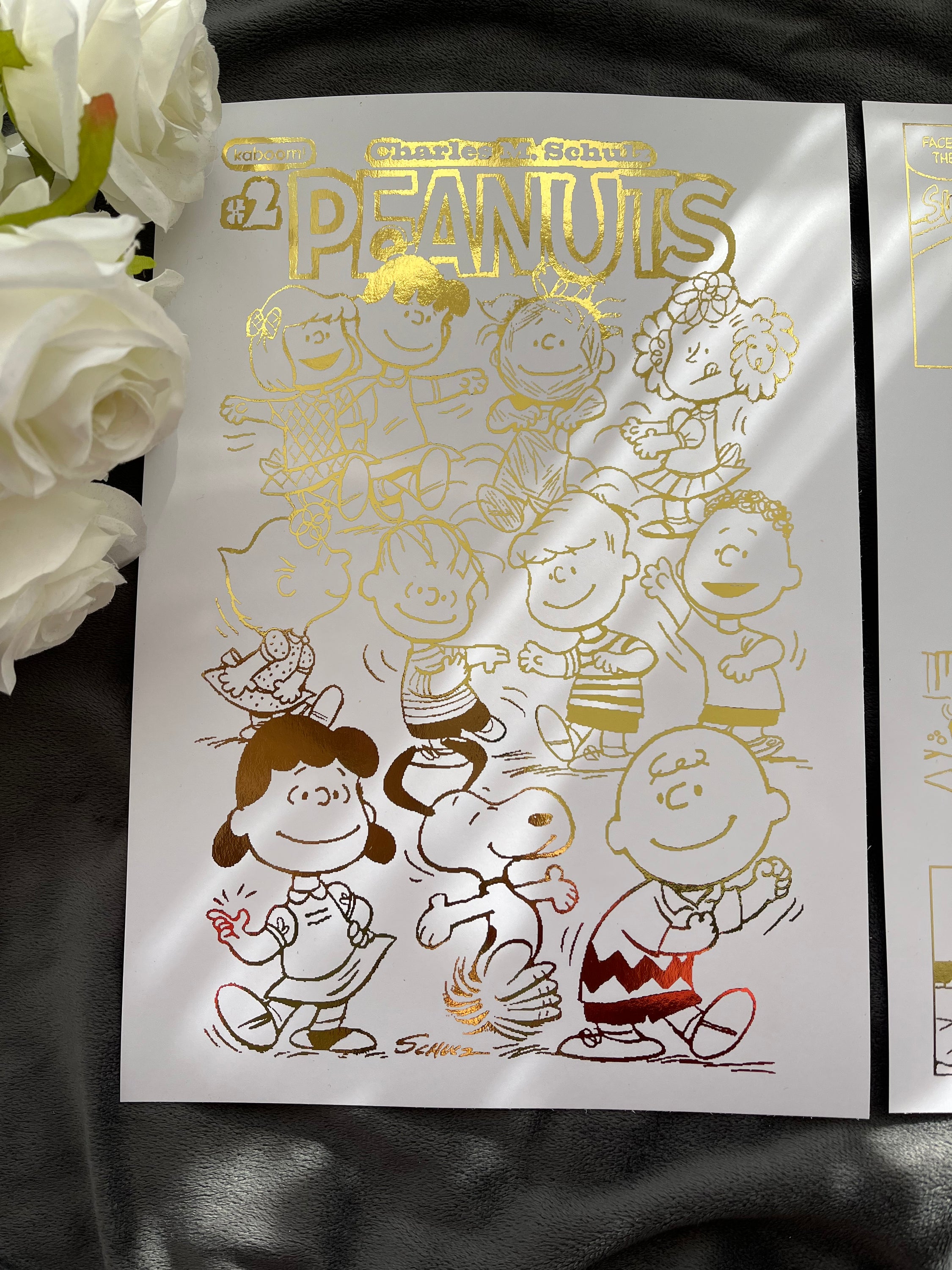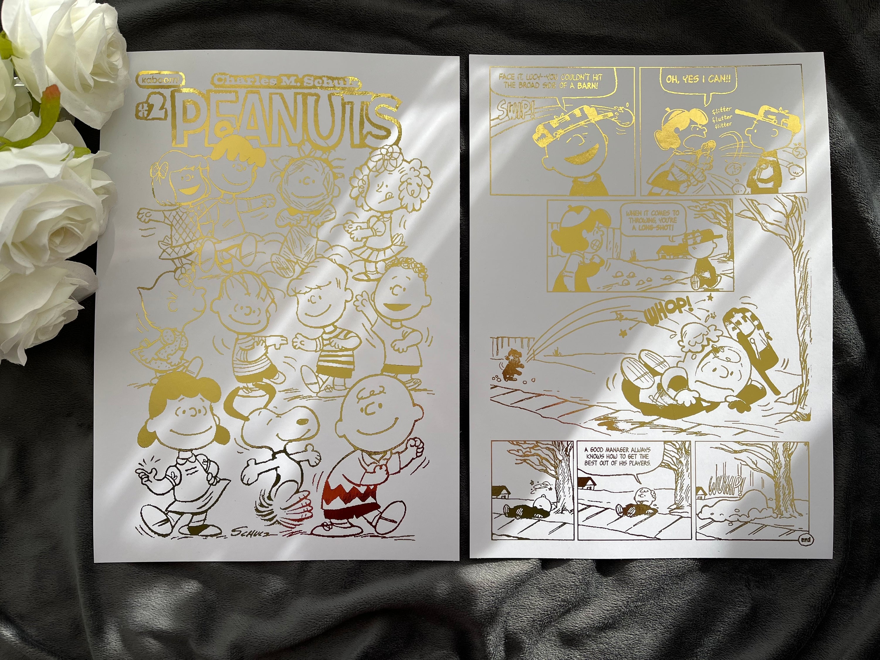 Introducing the Peanuts Comic Cover & Comic Strip Foil Print, a delightful collection that brings the beloved characters of Charles M. Schulz's Peanuts to life. This exclusive set includes two stunning prints, each beautifully rendered with gleaming gold foil accents that enhance the charm and humor of the iconic comic strip. Whether you're a long-time fan or new to the world of Peanuts, these prints are sure to captivate your heart.